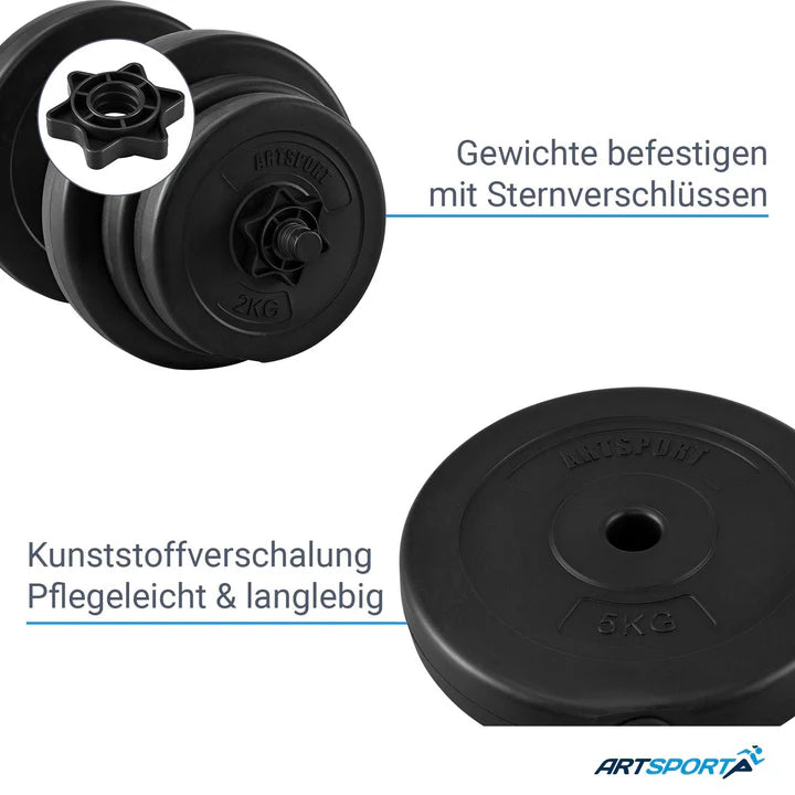Le set d'haltères de 40 kg d'ArtSport est idéal pour votre entraînement de musculation professionnel dans vos quatre murs. Avec 2 barres d'haltères et 12 plaques de poids dans trois catégories de poids différentes, vous favorisez le développement musculaire et la définition musculaire. L'ensemble complet est idéal pour les femmes et les hommes. Vous avez dû faire une pause sportive ou vous souhaitez établir une routine de remise en forme ? Développez vos muscles efficacement depuis la maison avec l'ensemble d'haltères. Vous vous épargnez également des déplacements fastidieux et pénibles dans une salle de sport bondée.