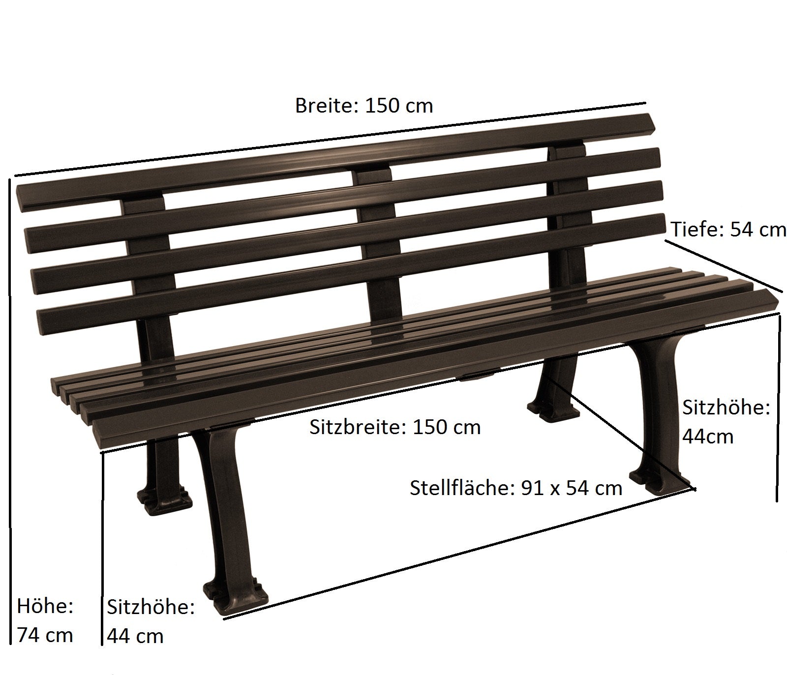 Le banc ne nécessite aucun entretien et ne nécessite aucun soin particulier : les pieds sont en PP robuste et comportent des encoches où le banc peut être ancré/vissé dans le sol. Les lattes (9 profilés multi-chambres 50 x 30 mm) sont en PVC résistant.
