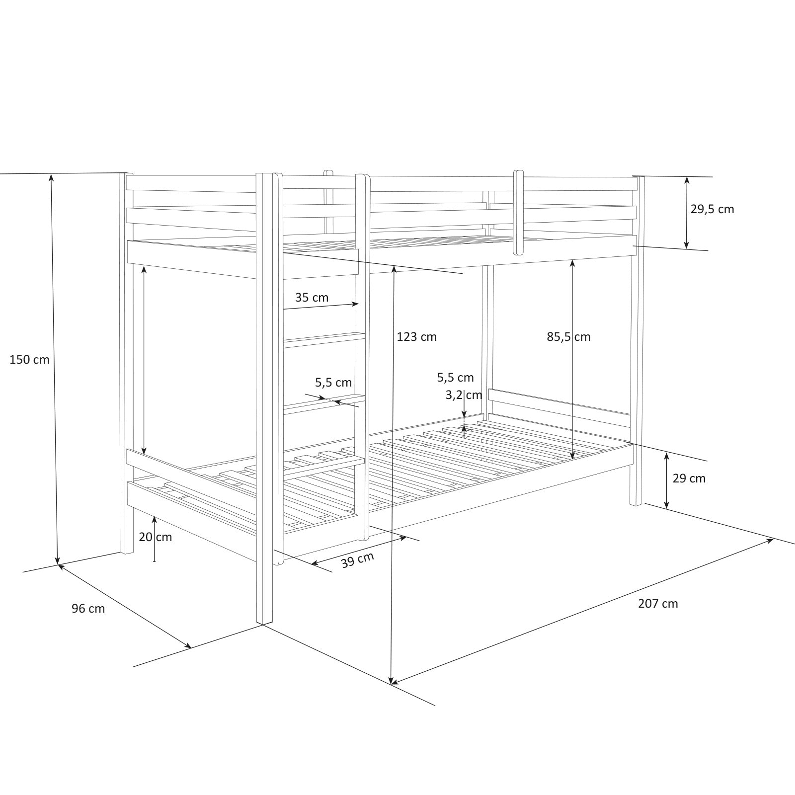 Das Etagenbett verfügt über zwei Liegeflächen, die durch eine stabile Leiter miteinander verbunden sind. Der obere Schlafbereich ist mit einem umlaufenden Rausfallschutz ausgestattet, der für maximale Sicherheit sorgt. Die robuste Konstruktion gewährleistet einen sicheren und komfortablen Schlafplatz für Kinder und Jugendliche. Im Lieferumfang sind passende Lattenroste und Matratzen enthalten, die für optimalen Schlafkomfort sorgen und die Montage erleichtern.