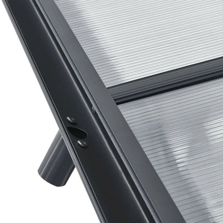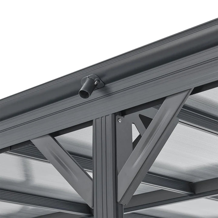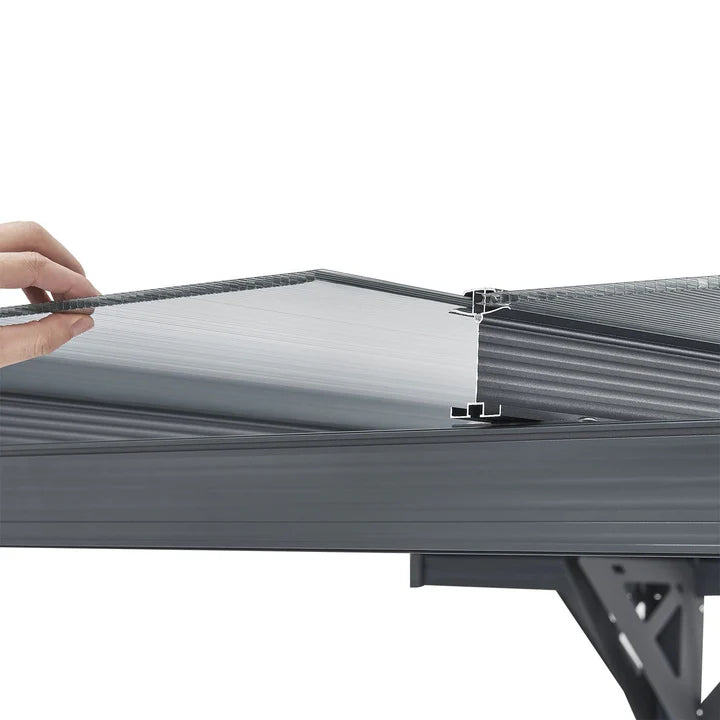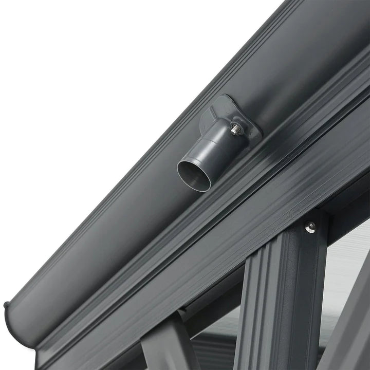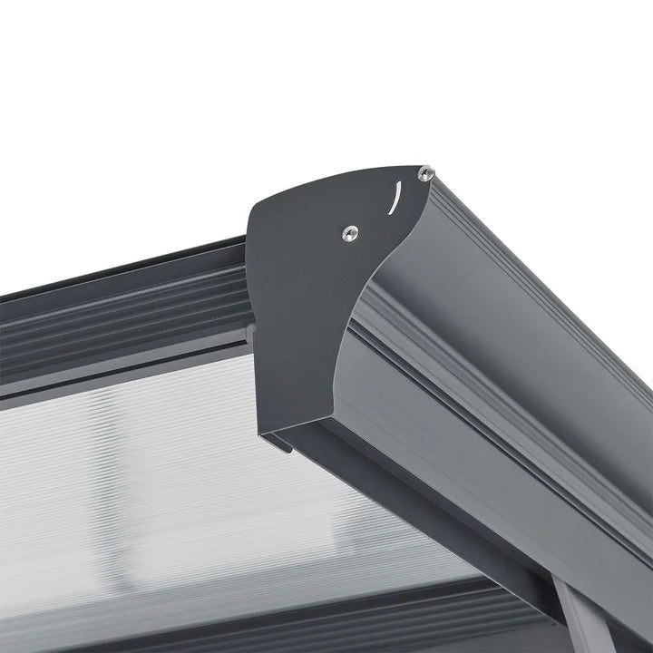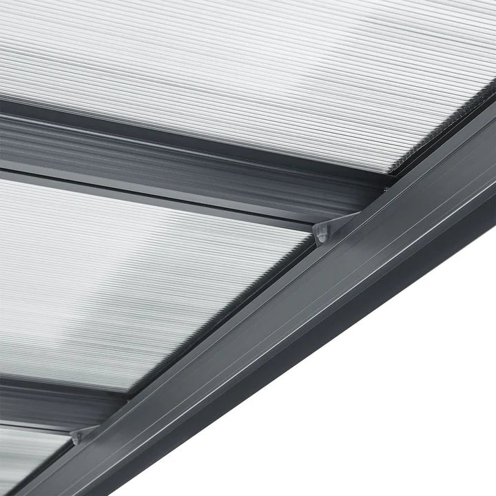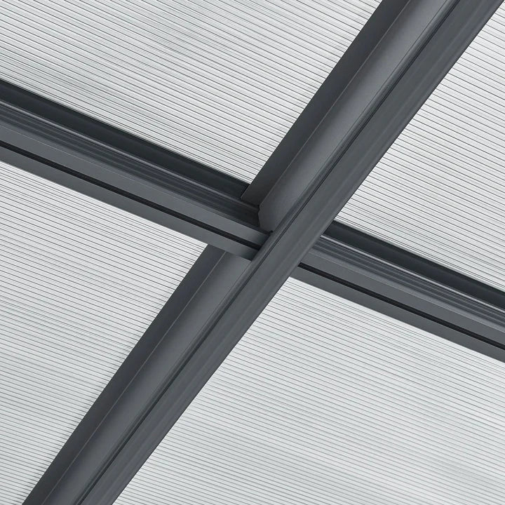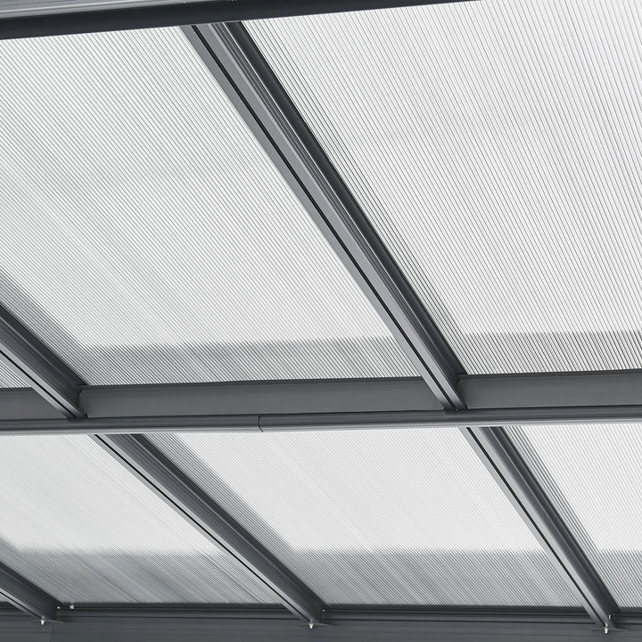 Le toit est doté de panneaux gris à double paroi en polycarbonate robuste. Ceux-ci protègent de la pluie, de la neige, de la saleté des arbres et des fientes d'oiseaux. De plus, ils sont translucides et offrent un puits de lumière pratique. Les panneaux multiparois sont également recouverts d'une couche de protection UV.