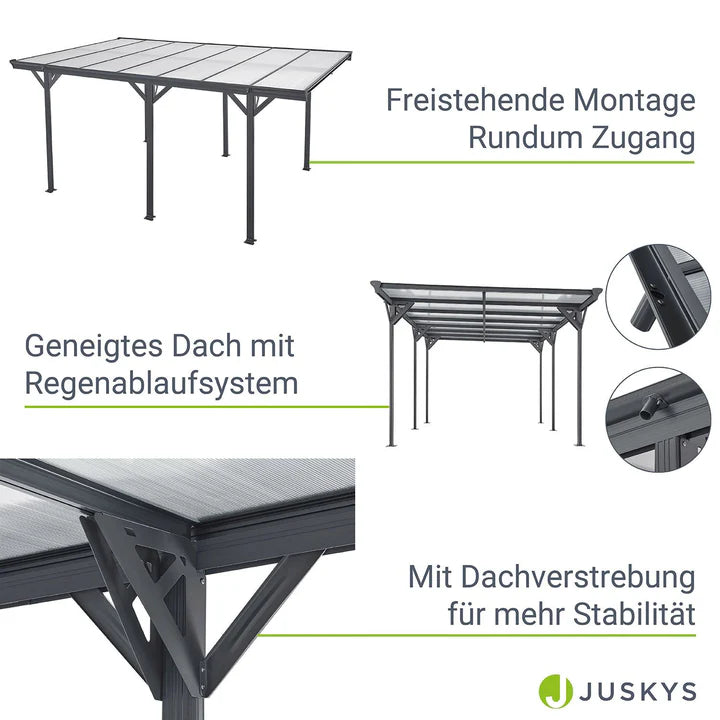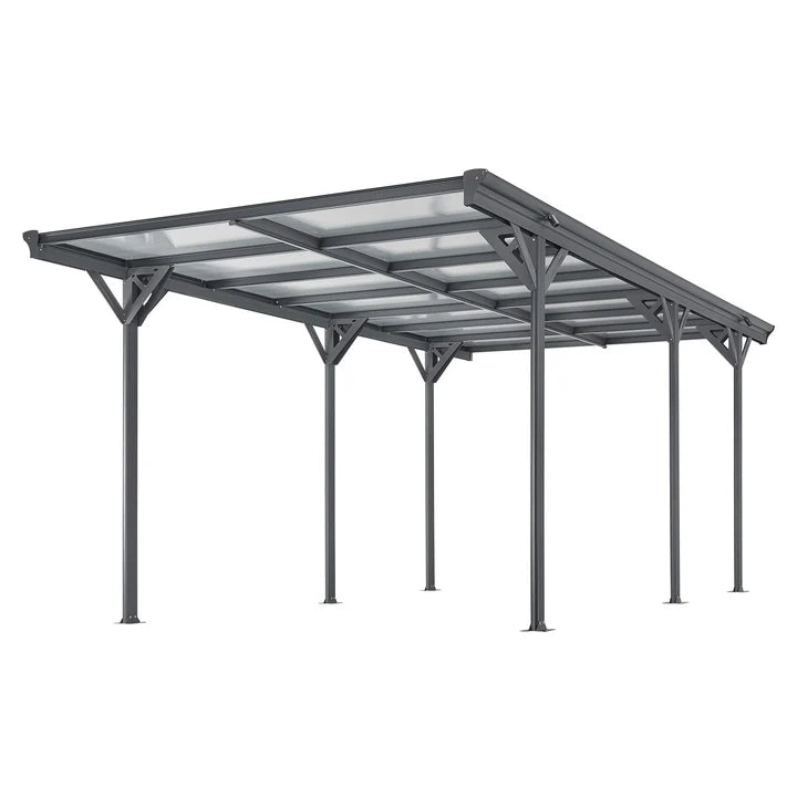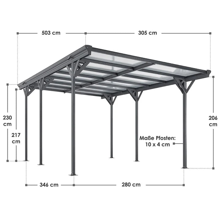 Le carport robuste offre 15 m² de protection efficace pour votre véhicule contre le soleil, la pluie et d'autres influences météorologiques. La construction en aluminium léger mais durable est résistante aux intempéries grâce au revêtement par poudre et assure une longue durée de vie. Des panneaux à double paroi de 6 mm d'épaisseur avec protection UV pratique sont installés dans le toit. Ils fournissent un puits de lumière utile, qui rend inutiles les sources de lumière supplémentaires, au moins pendant la journée. Le carport de haute qualité offre suffisamment d'espace et un toit de protection pour votre voiture, moto, vélo ou même un petit bateau. Alternativement, vous pouvez également utiliser le produit comme couverture de terrasse toute l'année.
