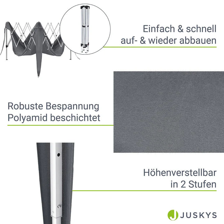 Le système de pliage pratique permet un montage et un démontage rapides en quelques minutes – sans aucun outil. Le cadre peut être facilement ouvert. Vous vous épargnez les tracas liés à l'assemblage des poteaux. Dans le même temps, le pavillon éphémère peut être utilisé de manière rapide et flexible.
