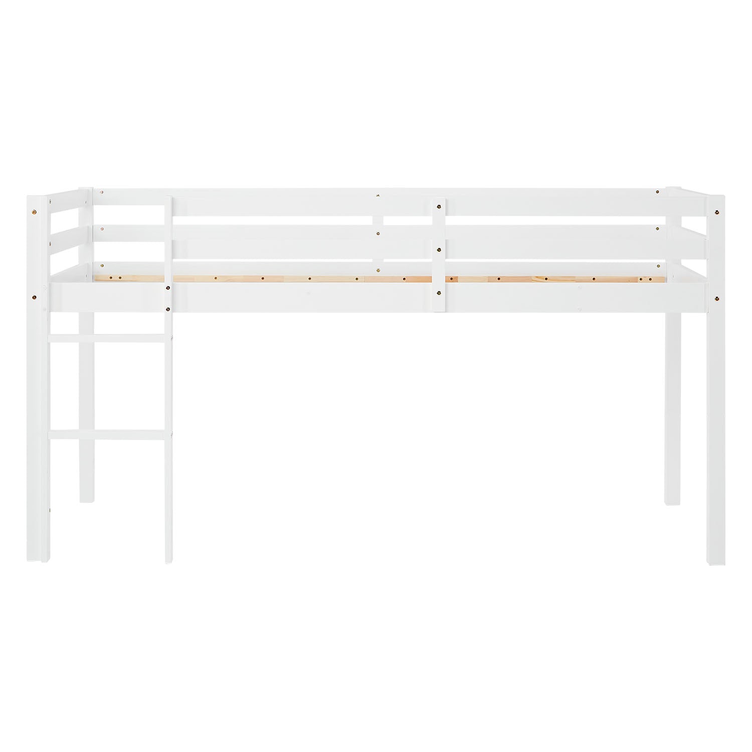 Ce lit mezzanine blanc simple et stable est notre modèle de base et est également disponible en différentes couleurs et fonctionnalités supplémentaires. Selon la configuration de la pièce, l'échelle peut être montée à gauche ou à droite.