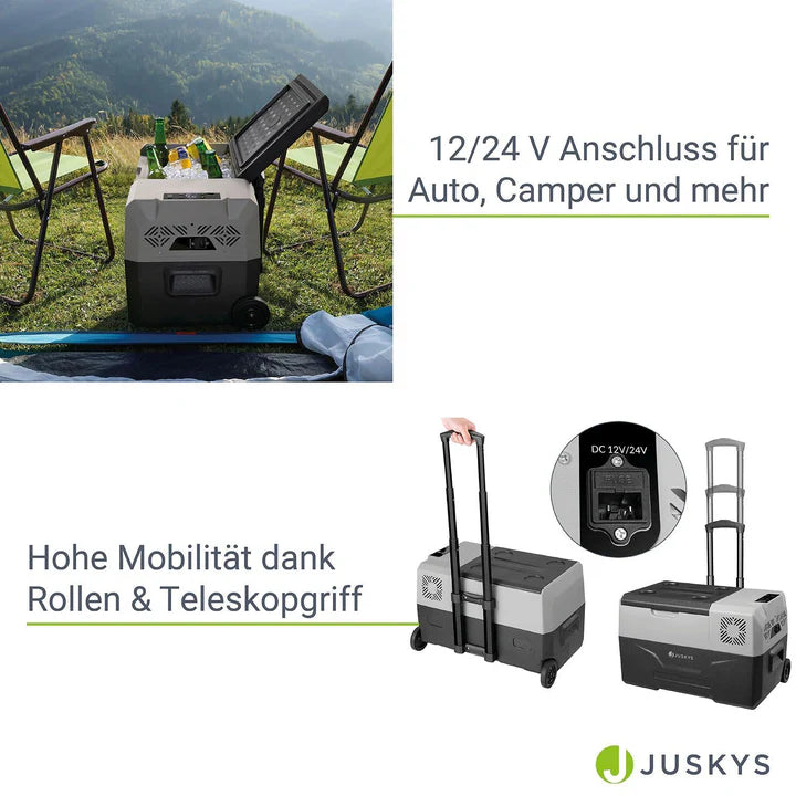Grâce au raccordement 12/24 V, vous pouvez facilement utiliser la glacière en déplacement dans votre voiture, camion ou camping-car. Pour une plus grande mobilité, il est également équipé de roues souples et d'une poignée télescopique.