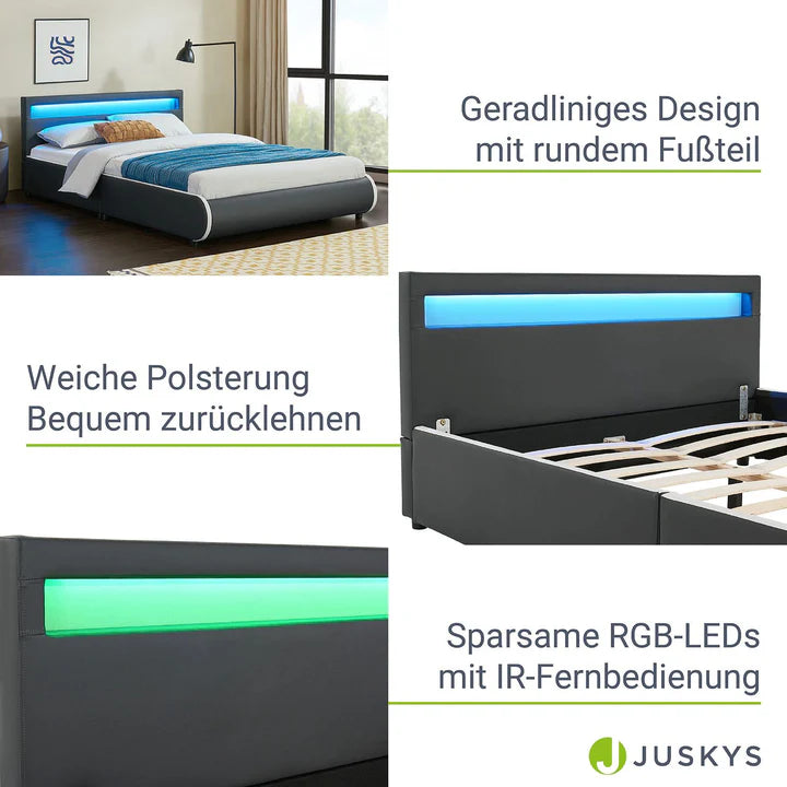 Une bande LED intégrée dans le dossier crée une atmosphère atmosphérique dans la chambre. Vous pouvez utiliser la télécommande pour choisir entre 16 réglages de couleurs et niveaux de luminosité différents. Détendez-vous grâce à l'éclairage indirect tout en vous adossant à la tête de lit confortablement rembourrée.