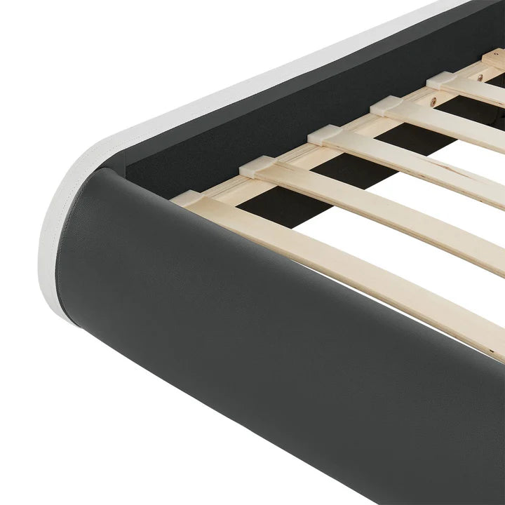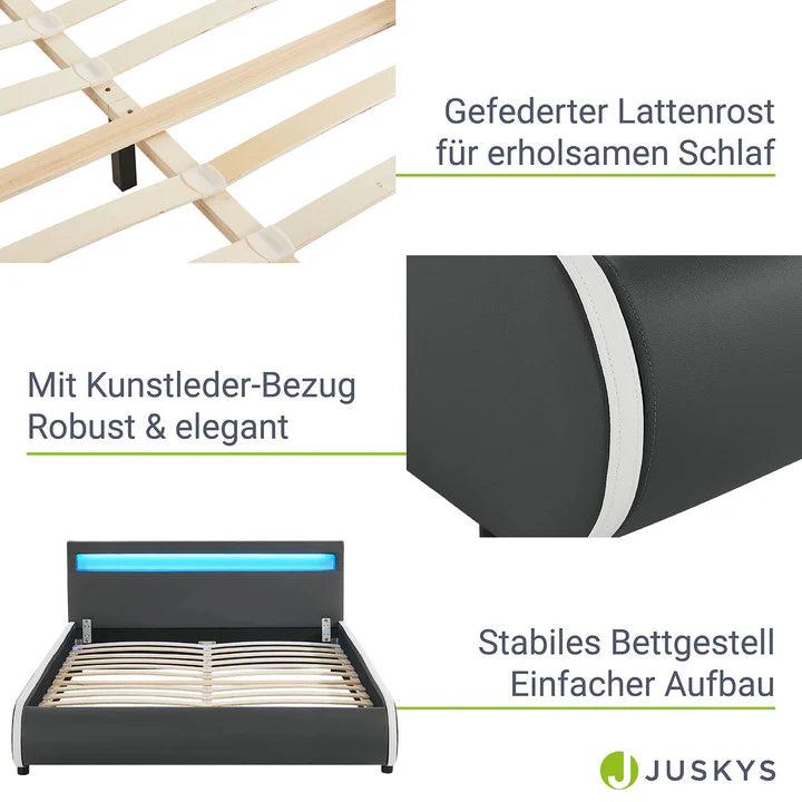 Le cadre de lit de 149,5 × 217 cm en bois MDF vous soutient de manière fiable pendant votre sommeil bien mérité. Il est extrêmement durable, facile à assembler et également légèrement rembourré. La housse en cuir synthétique résistant se nettoie facilement avec un chiffon humide.