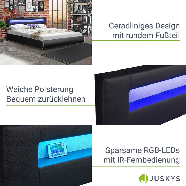 Une bande LED intégrée dans le dossier crée une atmosphère atmosphérique dans la chambre. Vous pouvez utiliser la télécommande pour choisir entre 16 réglages de couleurs et niveaux de luminosité différents. Détendez-vous grâce à l'éclairage indirect tout en vous adossant à la tête de lit confortablement rembourrée.