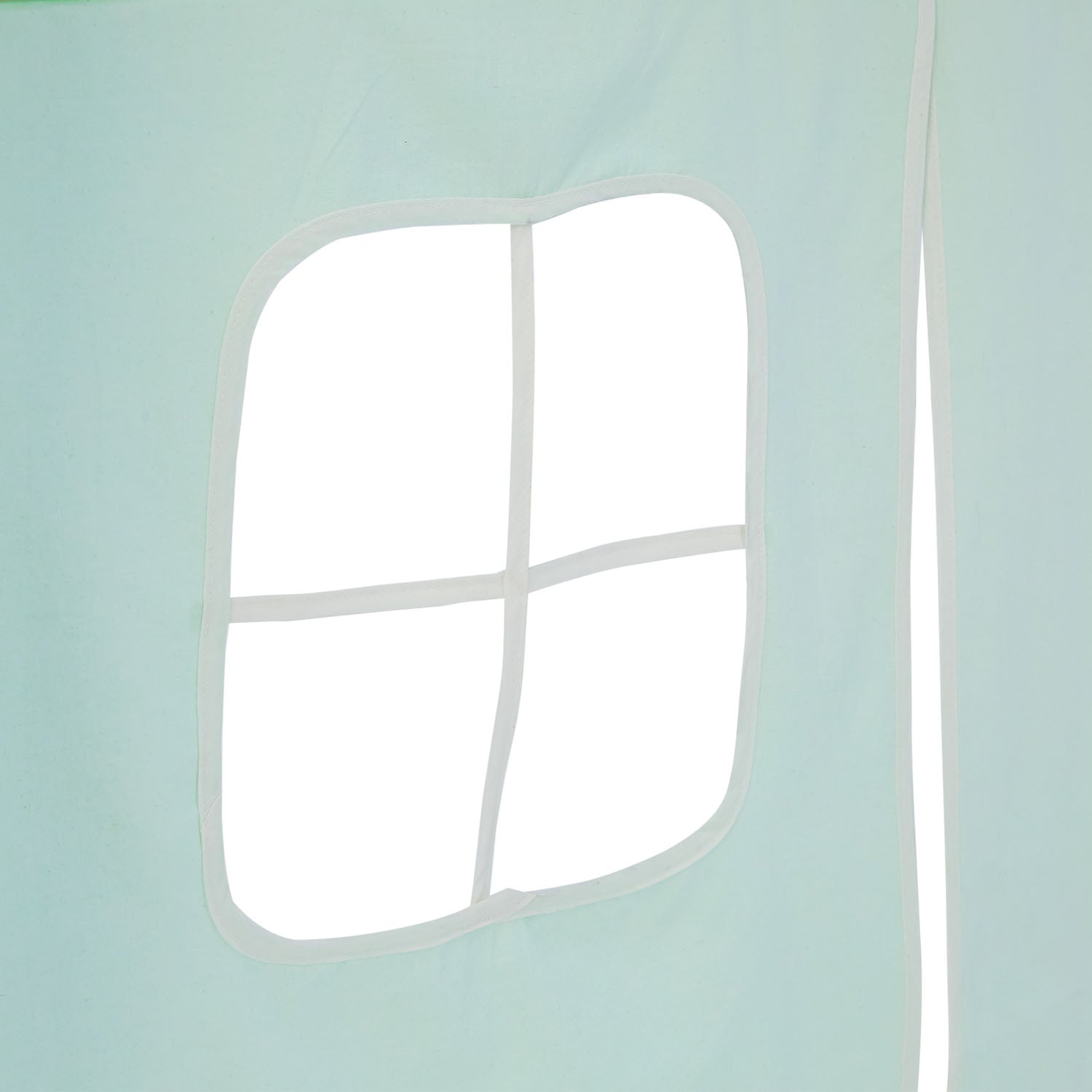 Besonders praktisch ist der Bereich unter der Liegefläche, der durch einen Stoffvorhang in sanften Grün- und Minttönen abgetrennt wird. Die eingearbeiteten Fenster verleihen dem unteren Raum eine offene und einladende Atmosphäre. Ob als Stauraum, Leseecke oder Rückzugsort hier entsteht eine flexible Fläche, die je nach Bedarf genutzt werden kann.
