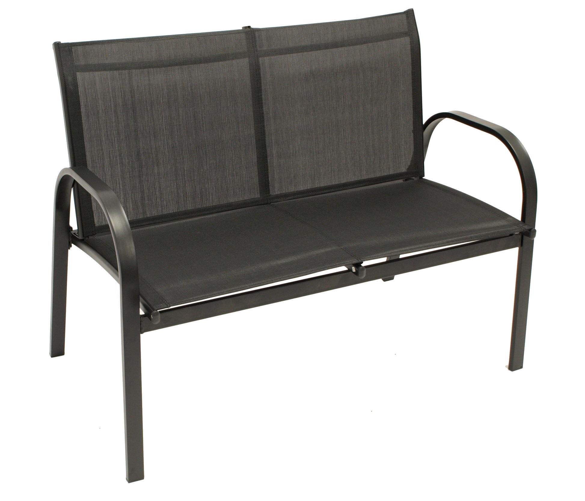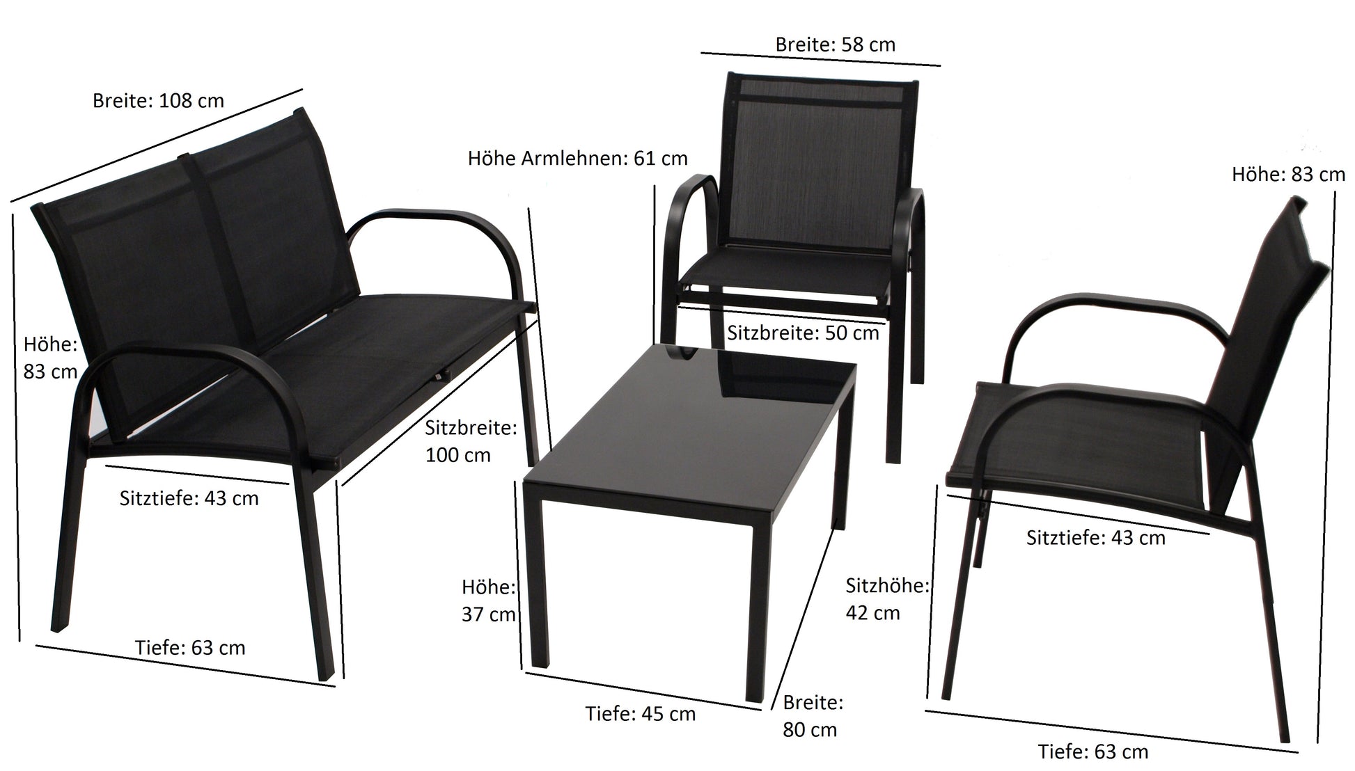 Les fauteuils et le canapé ont une structure en métal solide et un revêtement textile résistant aux intempéries (version 2*1). Le cadre est revêtu de poudre noire et toutes les pièces sont dotées d'accoudoirs pour augmenter le confort d'assise.
