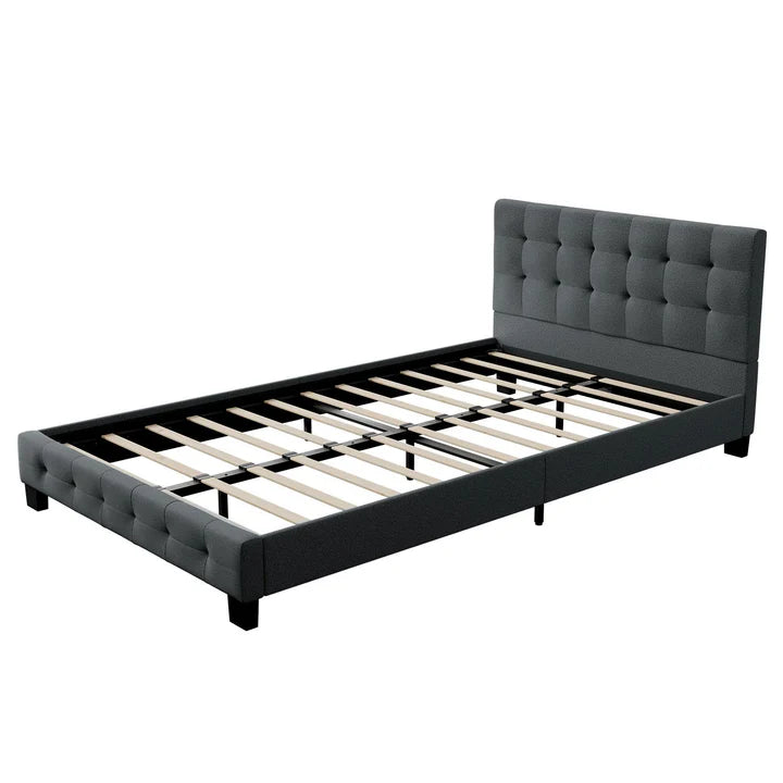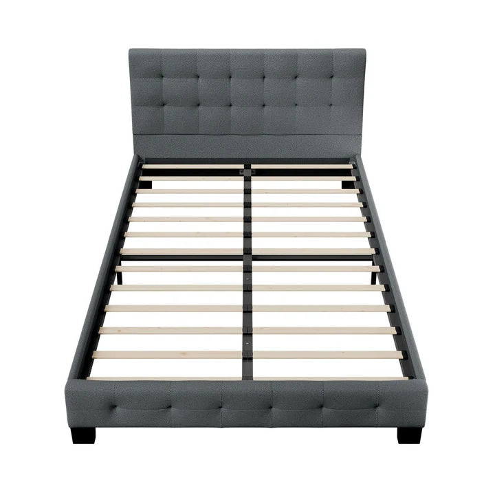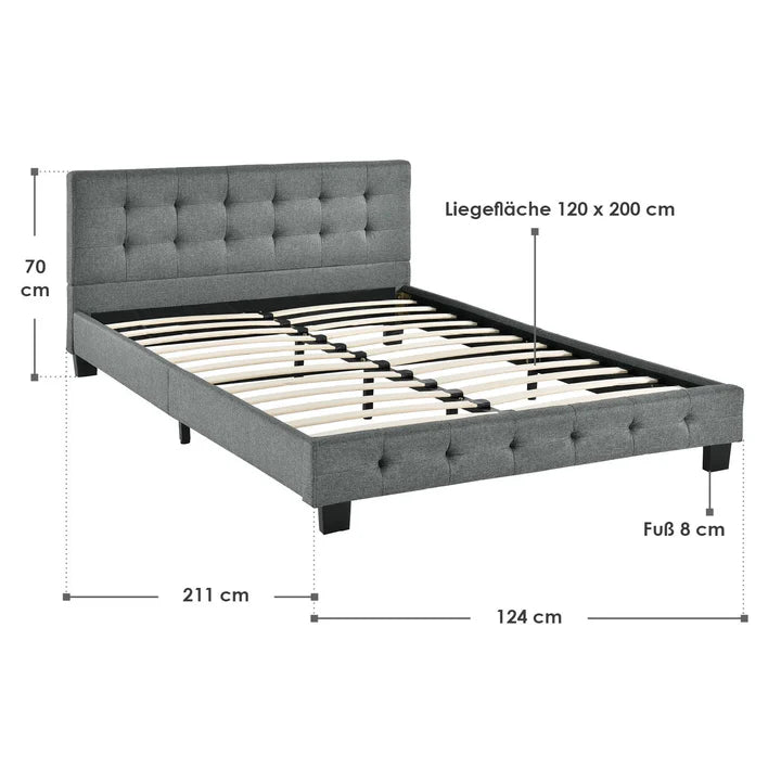 Le sommier à lattes en 24 pièces avec barre centrale stabilisatrice rend le lit extrêmement robuste. De plus, des pieds de support supplémentaires assurent un maintien ferme.Le choix du textile gris améliore non seulement l'apparence du lit, mais rend également le lit rembourré facile à entretenir.