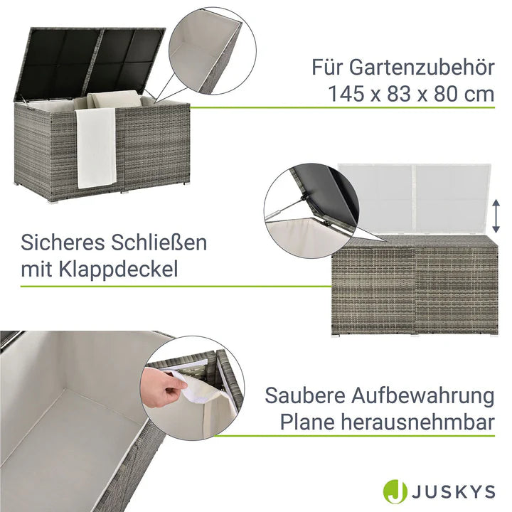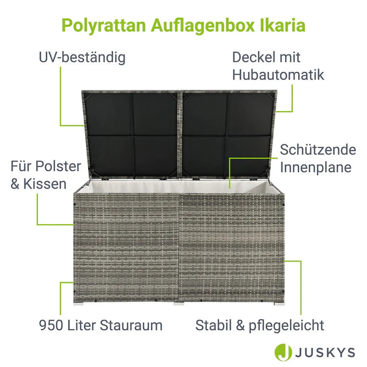 Voulez-vous garder les choses bien rangées à l’extérieur ? La boîte de rangement Ikaria - 145 cm de long, environ 80 cm de haut et de large - offre suffisamment d'espace pour les coussins de siège, les oreillers et les jouets des enfants. Les articles de jardin disponibles dans le commerce, tels que les arrosoirs, trouvent également une protection contre le soleil, la poussière et la saleté dans le coffre de rangement.