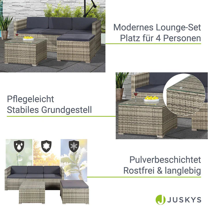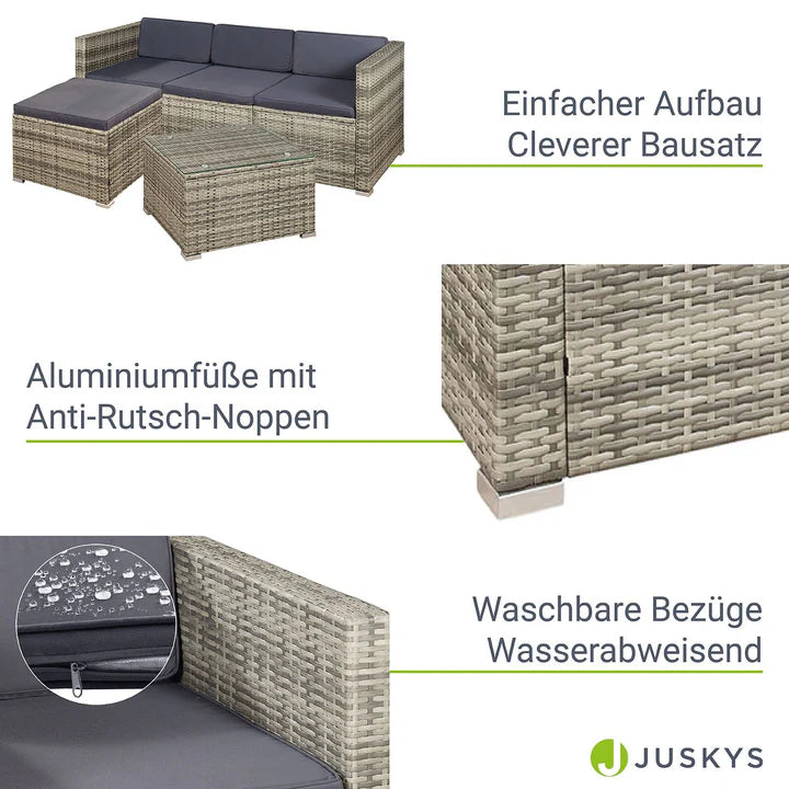 Le tissage en polyrotin est tissé à la main avec amour autour d'un cadre en acier thermolaqué. La construction en acier à plusieurs entretoises confère au salon de jardin une grande stabilité. Les meubles de salon reposent solidement sur le sol. Néanmoins, le mobilier est totalement léger. Ils sont faciles à soulever et à transporter vers un autre endroit.