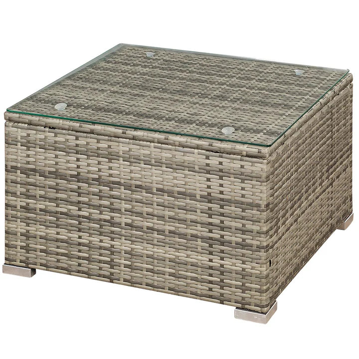 L'élégant salon en polyrotin Punta Cana M se compose d'un canapé, d'un tabouret et d'une table avec un plateau en verre. Le canapé confortable avec un dossier mi-haut offre une assise confortable pour 3 personnes. Vous pouvez utiliser le tabouret de 37 cm de haut comme siège supplémentaire ou comme repose-pieds. La table de 61 × 61 cm sert d'emplacement pour ranger verres et assiettes. Il est équipé d'un plateau en verre de sécurité de 5 mm d'épaisseur. La surface du verre est facile à entretenir et à nettoyer. 4 coussins d'assise et 3 coussins de dossier en mousse de 5 cm d'épaisseur complètent le grand salon. Les coussins sont recouverts de housses lavables en 100 % polyester.