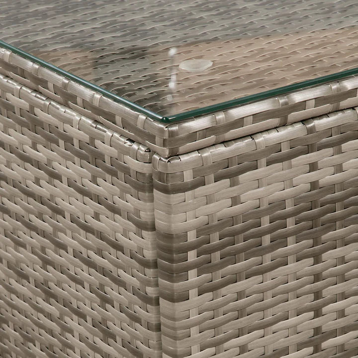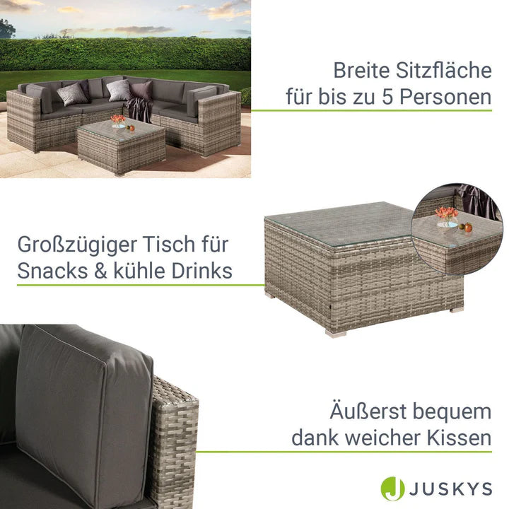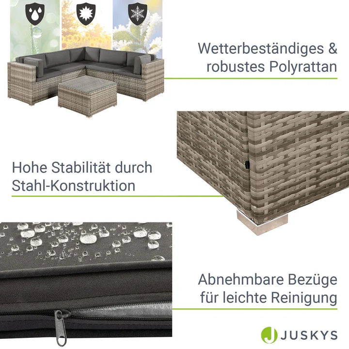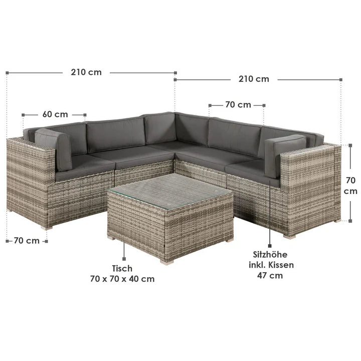 Le salon de jardin impressionne également en matière d'entretien. Le polyrotin résistant aux intempéries est anti-salissures et peut être facilement retiré de la saleté. Vous pouvez facilement nettoyer le plateau en verre de la table avec un nettoyant pour vitres standard et un chiffon doux. Les housses de coussin sont équipées d'une fermeture éclair dissimulée et peuvent être retirées rapidement et facilement. Les housses peuvent ensuite être lavées à 30 degrés.[TAB:Données techniques]
