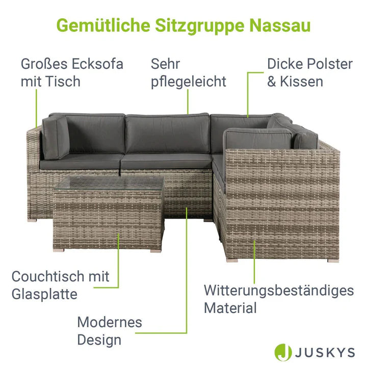 Le salon en polyrotin « Nassau gris » est disponible en kit à monter soi-même. La construction peut également être réalisée sans effort par des artisans non professionnels. Suivez simplement les instructions dans les instructions de montage incluses.
