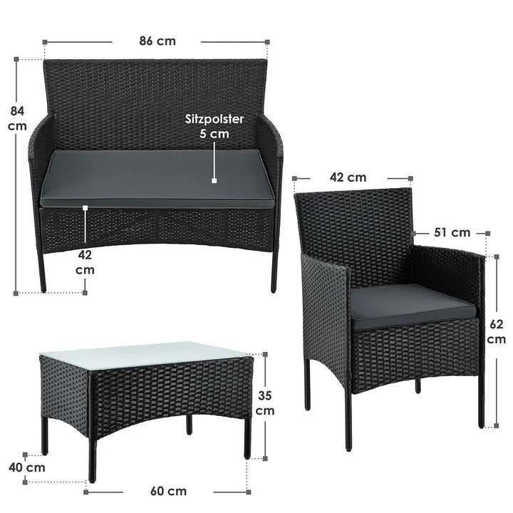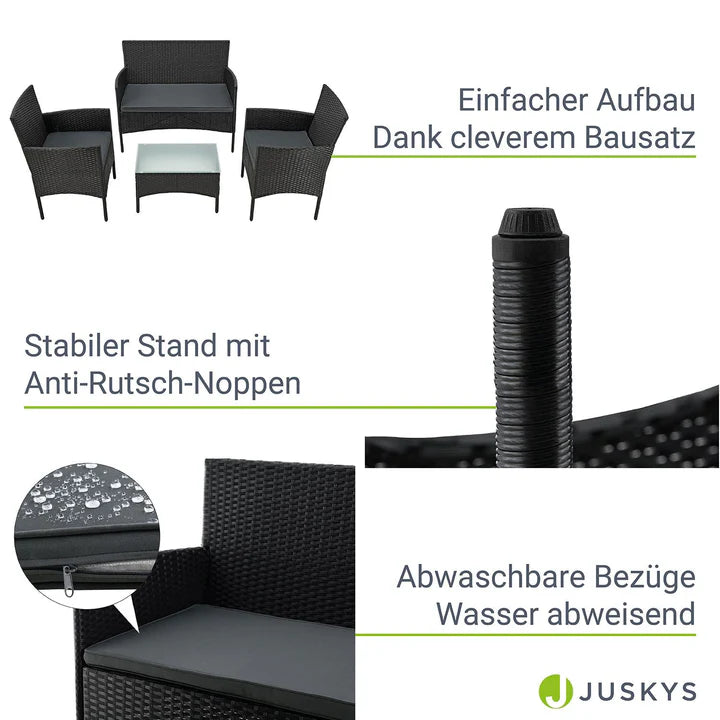 Le groupe de sièges en polyrotin est disponible en kit à monter soi-même. Les instructions illustrées avec des explications en allemand décrivent le montage étape par étape, de sorte que même les profanes n'ont aucun problème à le mettre en place.