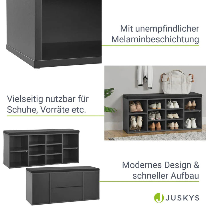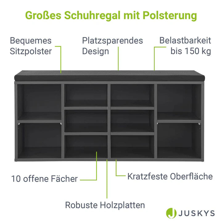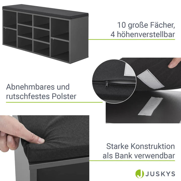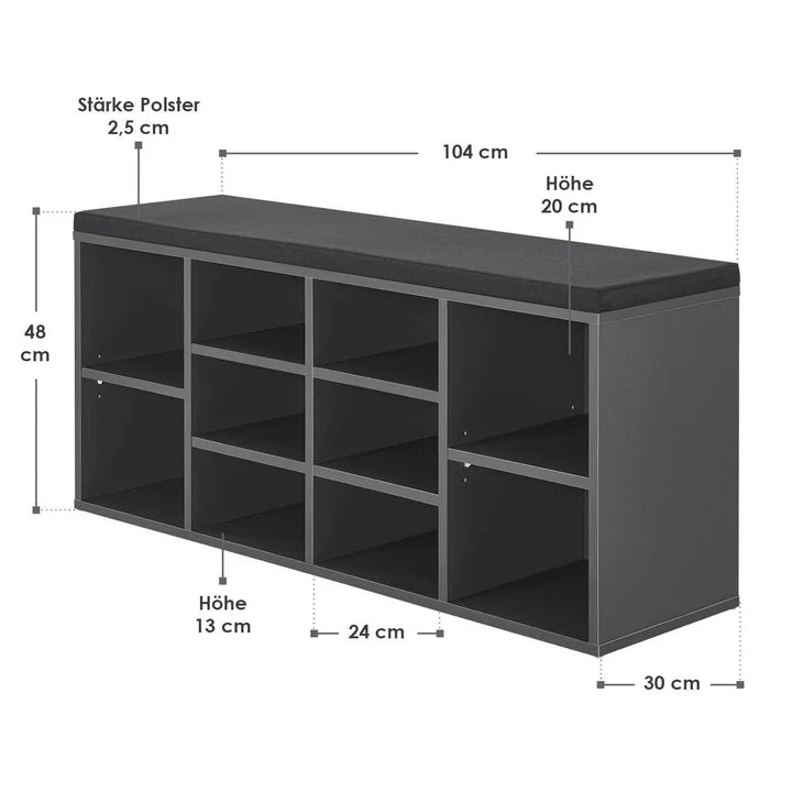La grande étagère à chaussures en bois allie espace de rangement pratique et sièges confortables. Que ce soit dans le couloir, la cuisine ou le salon, les 10 compartiments de différentes tailles offrent suffisamment d'espace pour les chaussures de ville, les talons hauts et les bottes de randonnée. Alternativement, l'armoire peut également être utilisée comme garde-manger ou pour ranger des jouets, des livres ou des objets de collection. Le revêtement confortable et amovible transforme l'étagère en un banc douillet pour se détendre ou mettre et enlever ses chaussures. Sans coussin d'assise, le banc sert de meuble bas pour la télévision ou peut être joliment présenté avec une certaine décoration.