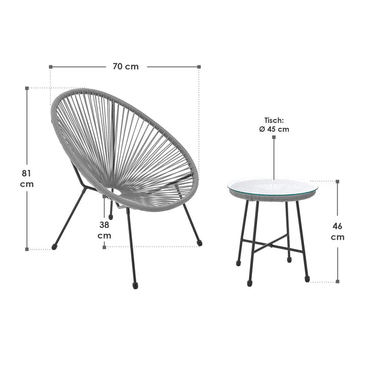 Con il set da balcone Ostana da 3 pezzi, composto da tavolo e 2 poltrone in grigio chiaro, otterrete un elegante gruppo di sedute per il vostro spazio esterno. Le comode poltrone lounge dal design retrò sono realizzate con una rete elastica e una robusta struttura in acciaio. Il set di mobili da giardino è resistente alle intemperie, ma diventa anche un vero e proprio elemento di attrazione all'interno. Le sedie con la rete traspirante hanno un aspetto grazioso, ma possono sostenere fino a 100 kg ciascuna e offrono un elevato livello di comfort di seduta.