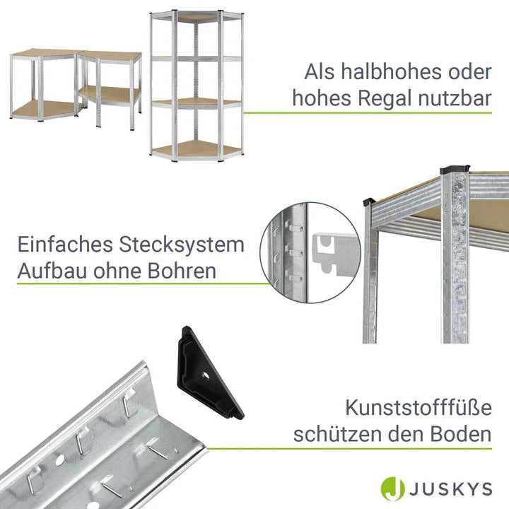 Con il pratico scaffale angolare Corner Easy in metallo zincato otterrete un pratico complemento per soggiorni, cantine, garage, officine e uffici. Offre molto spazio per riporre attrezzi, pezzi di ricambio e accessori da giardino. Progettato come soluzione angolare salvaspazio, questo robusto ripiano portaoggetti è ideale per gli angoli inutilizzati. Può essere abbinato anche ad altri ripiani profondi 40 cm, come il nostro scaffale portaoggetti Easy. I piedini gommati proteggono il pavimento da graffi e abrasioni.
