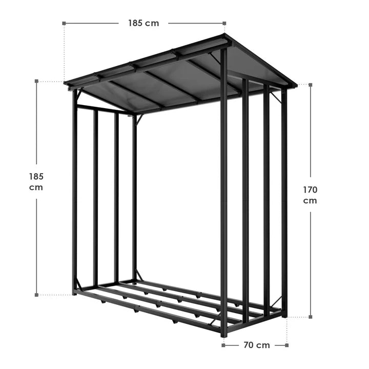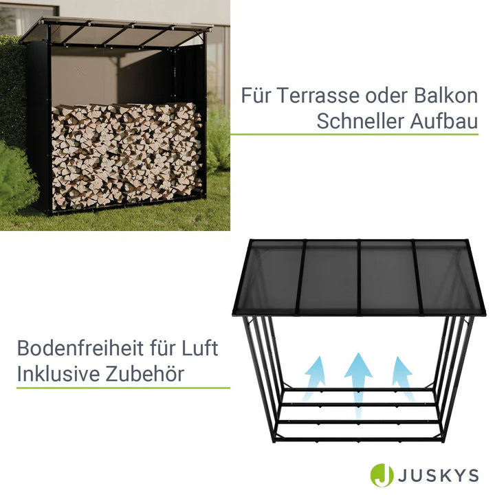 Das stabile Aluminiumgestell widersteht Wind und Wetter und bietet deinem Brennholz einen festen Platz, ob im Garten, auf der Terrasse oder dem Balkon.
