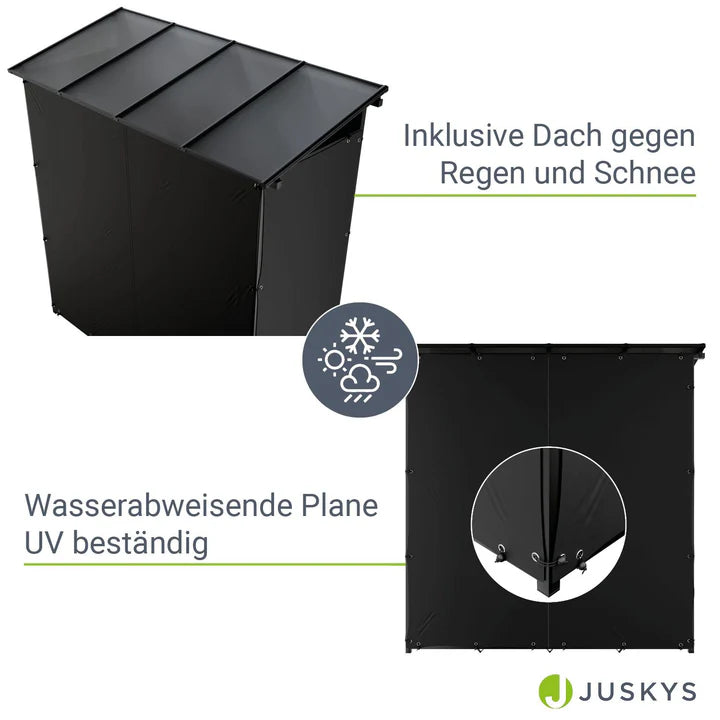 Ob Regen, Schnee oder Sonne – das Dach in Kombination mit der wetterfesten und UV beständigen Abdeckplane sorgen für trockenes und langlebiges Brennholz.
