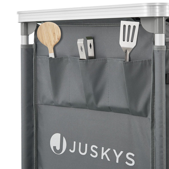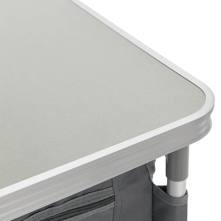 La cucina da campeggio compatta Ruda in grigio è un mobile da cucina leggero e robusto. È dotato di ripiani e scomparti laterali che offrono spazio per riporre pentole, posate e altri utensili. Sul piano di lavoro resistente e di facile manutenzione troverete tutto lo spazio necessario per lavorare. La cucina da campeggio è ideale per tutti i tipi di attività all'aperto come campeggio, escursionismo e picnic. Per riporre e trasportare facilmente la cucina è inclusa una pratica borsa per il trasporto. Il prodotto coniuga comfort e funzionalità in un prodotto di facile manutenzione.