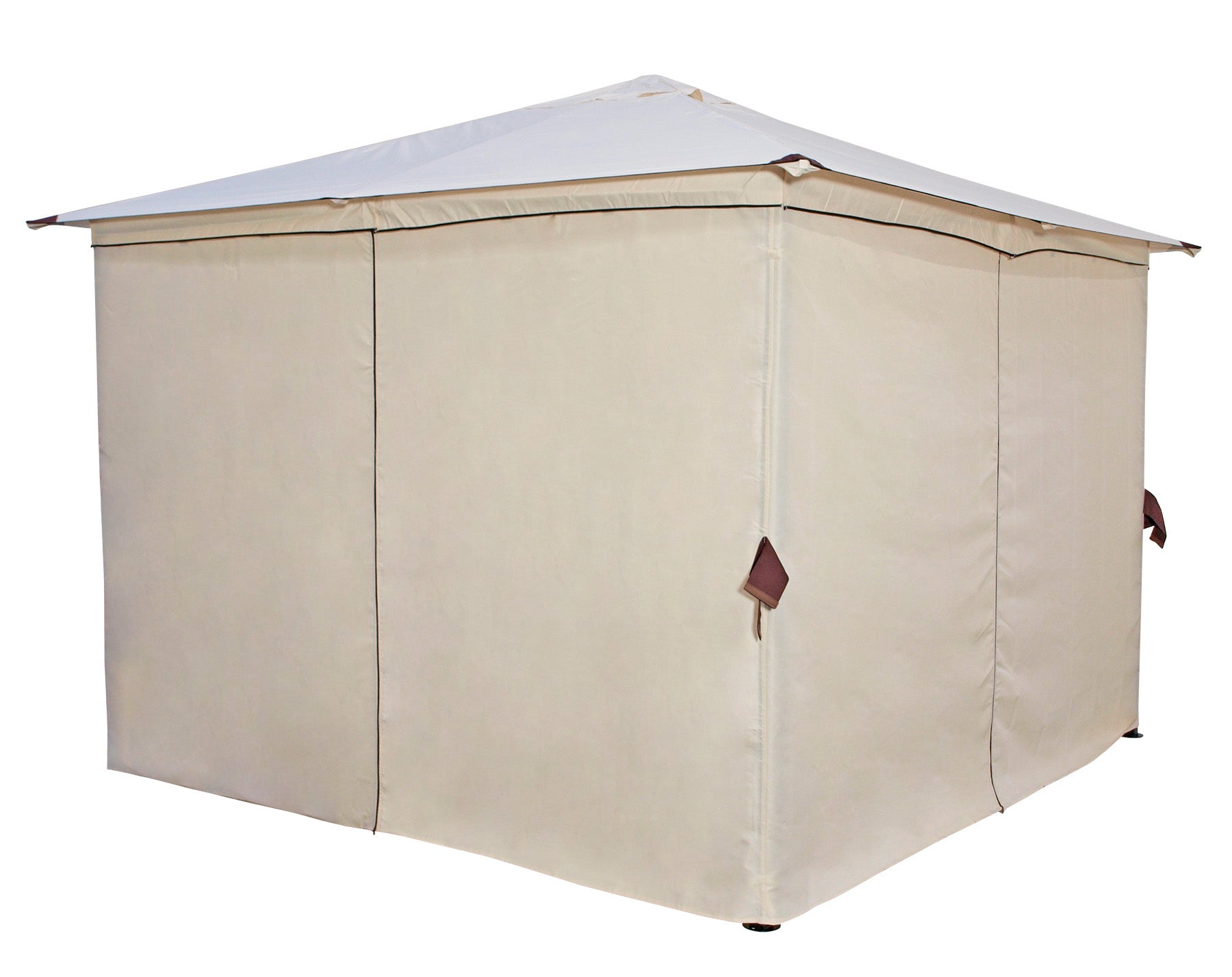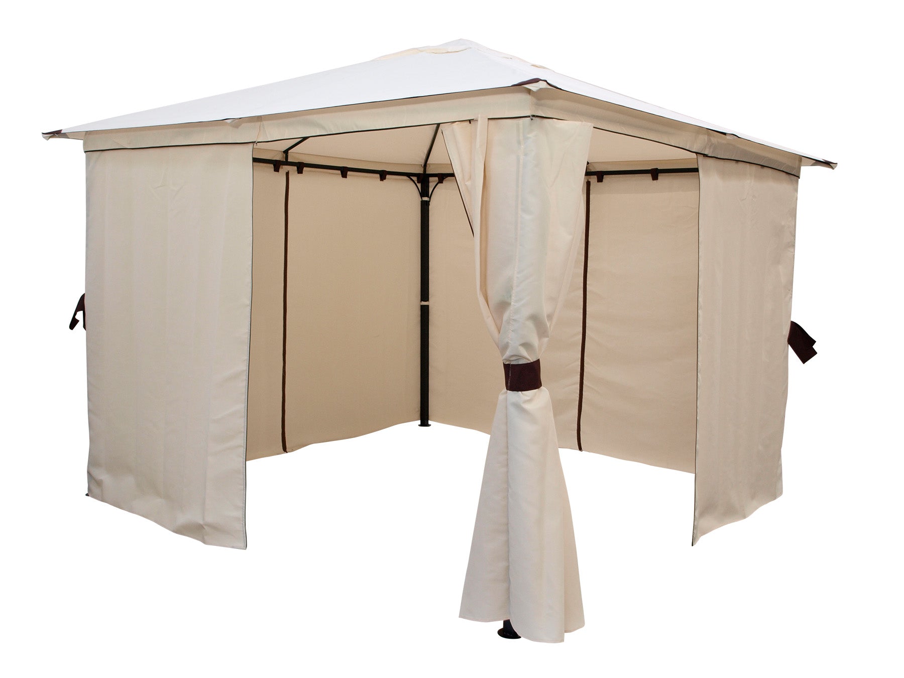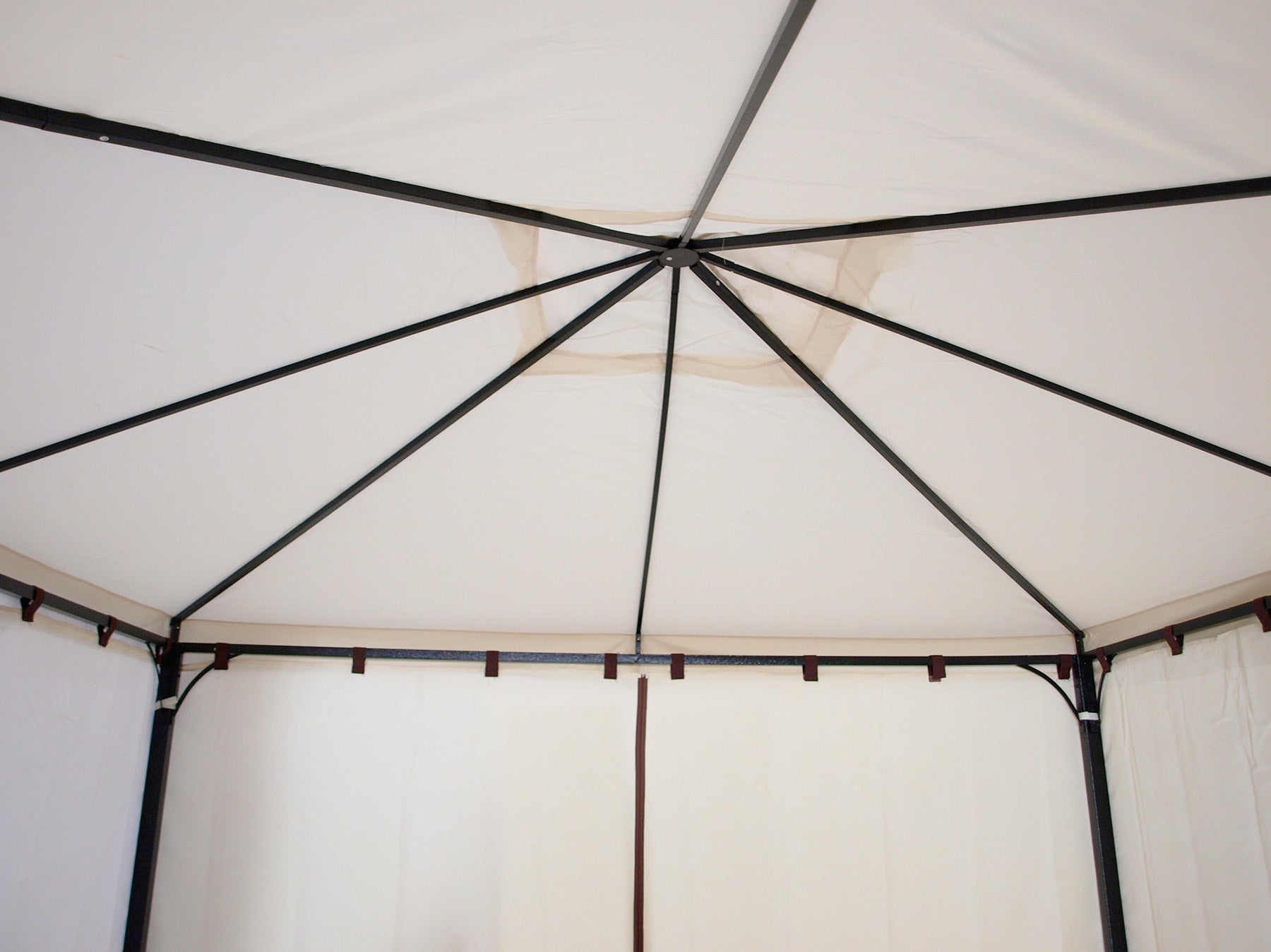 Elegante padiglione VENEZIA dal design robusto. Manto di copertura in poliestere impermeabile rivestito in PVC (250 g/m²), colore ecrù. Pannelli laterali in tessuto di poliestere coordinato, ecrù.