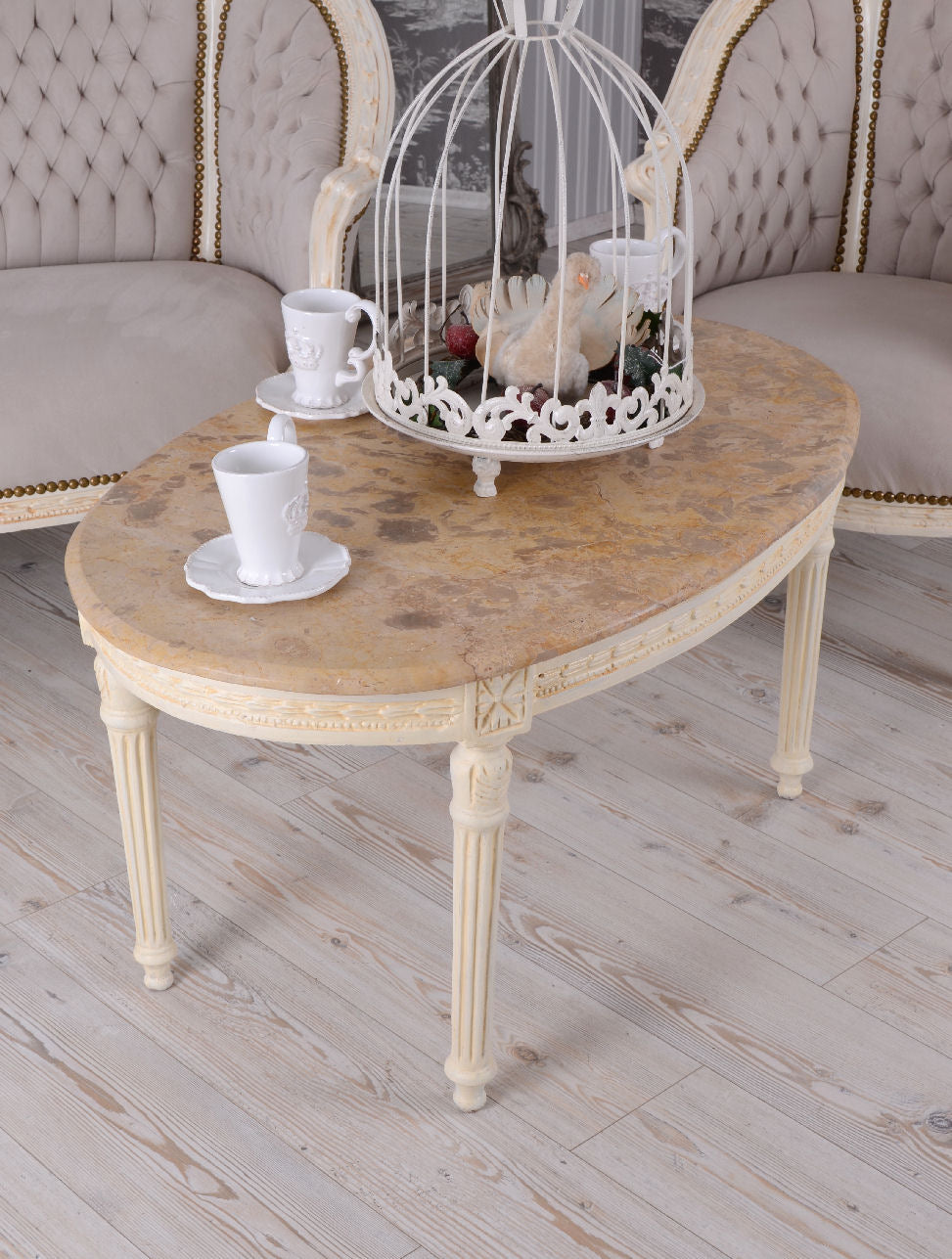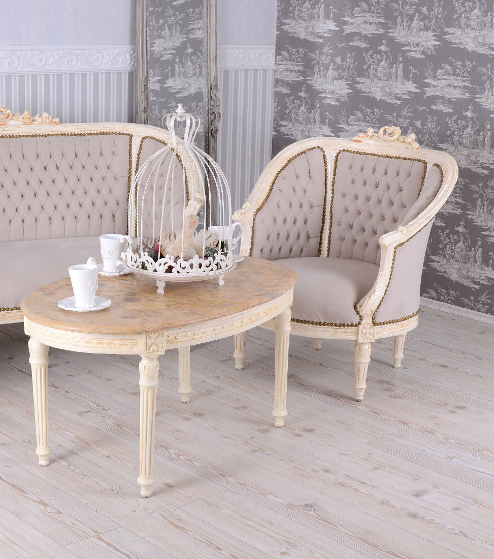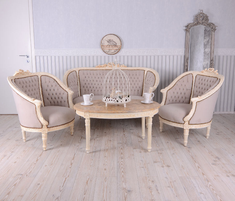 Un divano, due poltrone e un tavolino abbinato con piano in marmo in stile rococò.