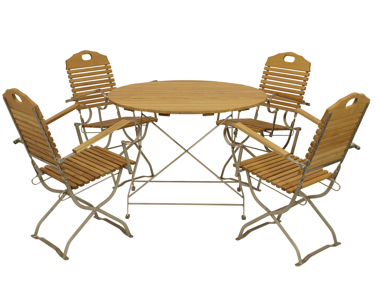 Il set Kurgarten qui proposto è composto da quattro poltrone e un tavolo rotondo. Il tavolo può ospitare fino a sei persone; se necessario, è possibile acquistare sedie o poltrone singole.