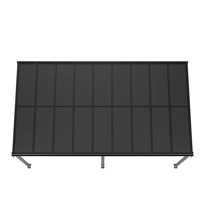 Il tetto del patio è realizzato con pannelli multiparete in policarbonato grigio, resistenti alle intemperie, agli urti e durevoli. Il materiale traslucido impedisce l'accumulo di calore e la pellicola protettiva ti mantiene protetto.