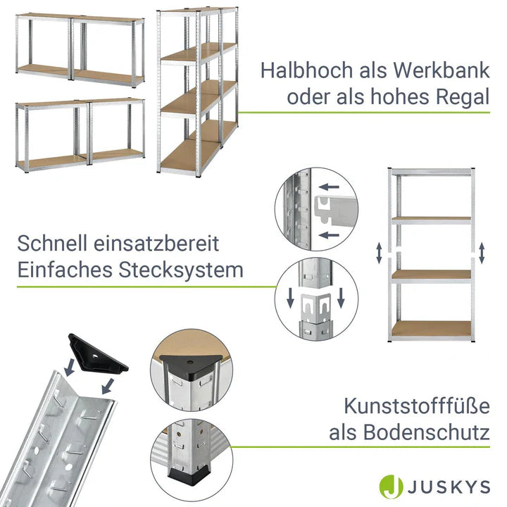Die beiden Metallregale lassen sich durch die zweiteiligen Streben auch als halbhohe Regale oder als Werkbänke aufbauen. Ideal, wenn Sie die beiden Schwerlastregale unterhalb einer Treppe oder in einer Dachschräge aufstellen möchten.