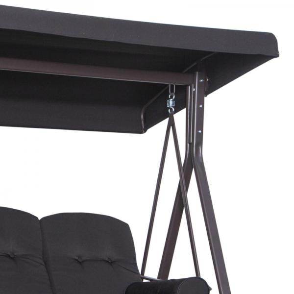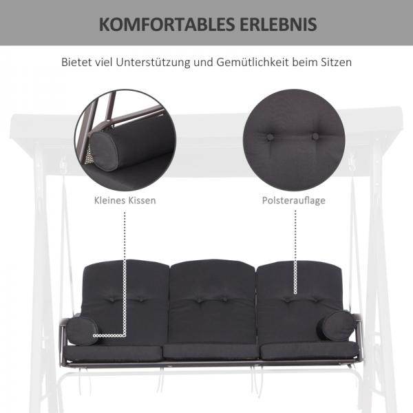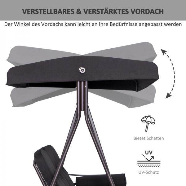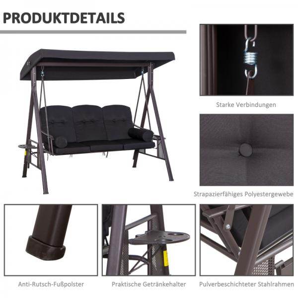 Auf der Terrasse frühstücken, die Sonne genießen, mit Freunden und Familie an der frischen Luft sitzen: Mit unserer Gartenschaukel für Erwachsene von Outsunny sitzen Sie bequem in jeder Situation. Bis zu drei Personen finden auf diesem Schaukel in eleganter dunkelgrau-brauner Farbkombination Platz. Für besonderen Sitzkomfort sorgt die 8 cm dicke Polsterung und an beiden Seiten der Outdoor-Schaukel ist eine kompakte Ablage angebracht, auf der Snacks, kühle Getränke und ein gutes Buch sicher Platz finden.