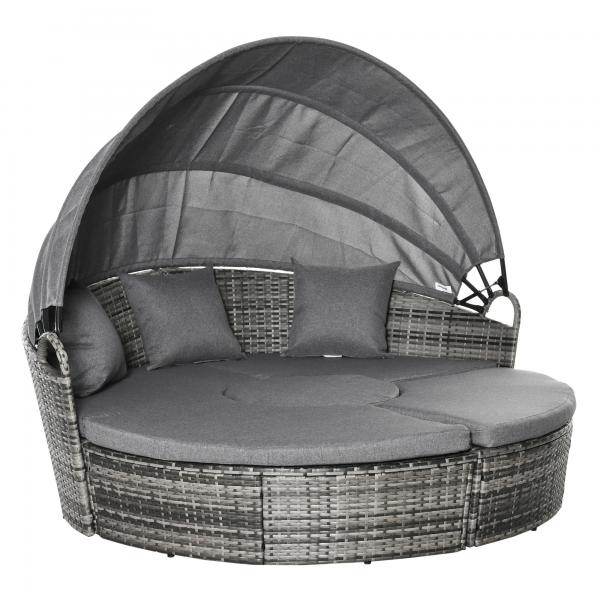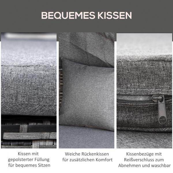 Ein wunderschönes PE-Rattan-Lounge-Set von Outsunny. Das Set besteht aus zwei Sesseln, zwei Hockern und einem höhenverstellbaren Couchtisch, die zu einer großen Liege arrangiert werden können. Die solide, wetterbeständige Konstruktion besteht aus einem verzinktem Rohrrahmen und PE-Rattan. Weiche Polster und zusätzliche Kissen bieten viel Liegekomfort, während der Baldachin sie vor Sonne und Regen schützt. Dieses clevere Lounge-Set lädt zum Verweilen und Entspannen ein, egal bei welchem Wetter.