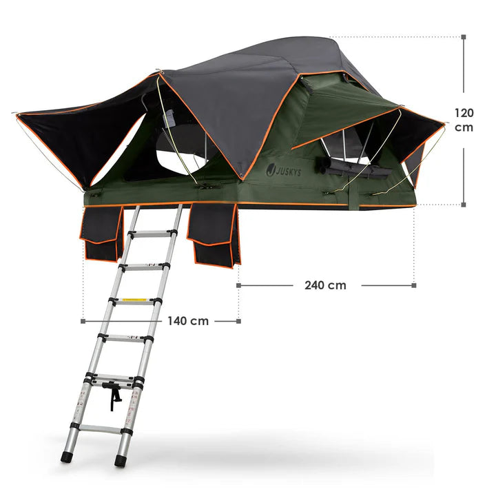 Spare dir teure Hotelkosten und schlafe flexibel dort, wo du gerade bist – ganz ohne lästige Hotelsuche. Entdecke das Autodachzelt Lago in Schwarz/Olivengrün – die ideale Lösung für komfortables Camping direkt auf dem Fahrzeugdach. Es passt auf jedes Auto mit Dachträger und bietet Schlafkomfort für 2-3 Personen. Die bequeme, herausnehmbare Matratze, der stabile Aluminiumrahmen sowie hochwertige, wasserabweisende Materialien sorgen für Schutz vor UV-Strahlung und Feuchtigkeit. Die praktische Teleskopleiter ermöglicht einen bequemen Einstieg, während das aerodynamische Design wie eine Dachbox auf dem Auto sitzt. Für nächtliche Einsätze ist sogar eine integrierte LED-Beleuchtung an Bord. Perfekt für Roadtrips, Outdoor-Abenteuer oder spontane Wochenendausflüge – mit dem Lago Dachzelt genießt du Freiheit und Komfort, wo auch immer du bist.