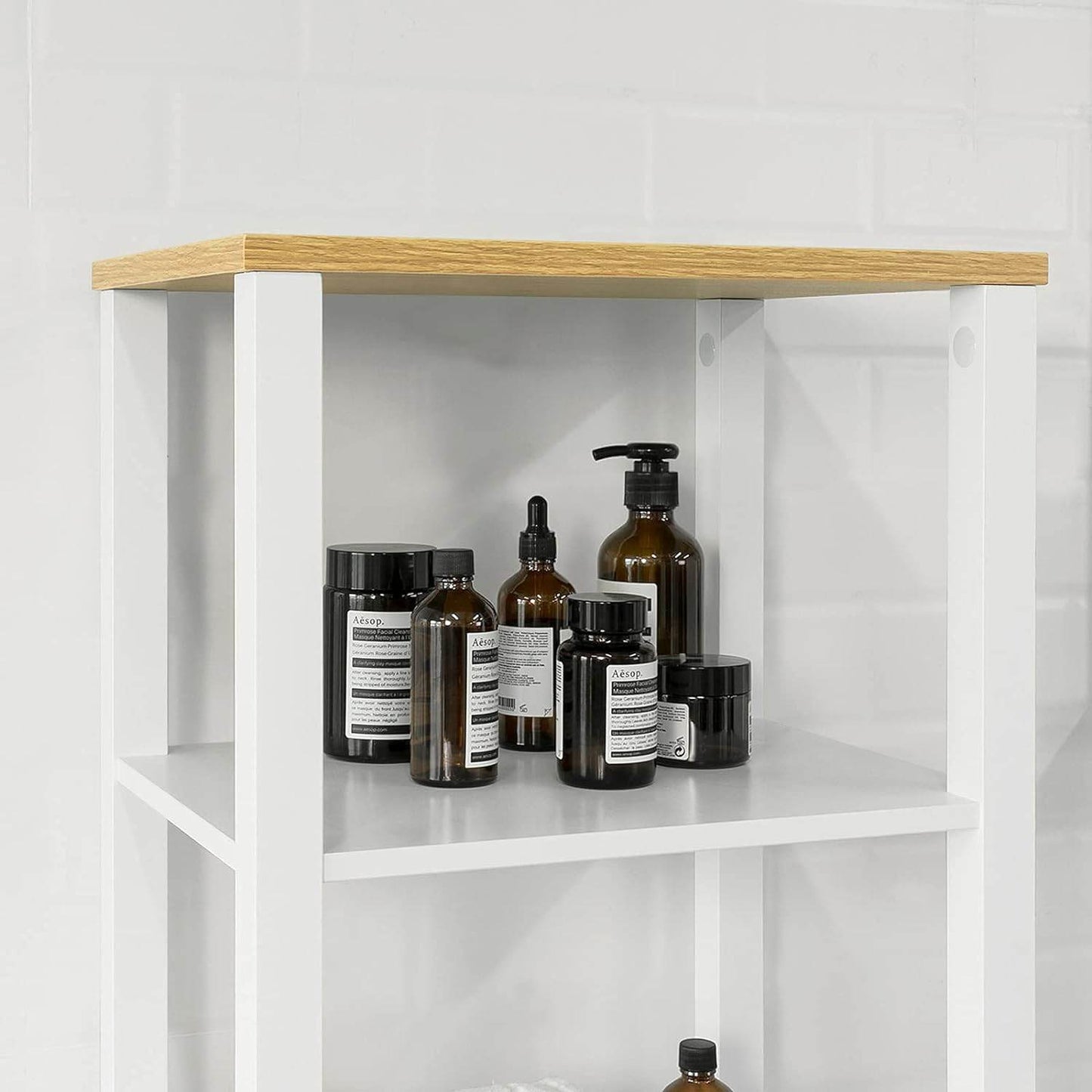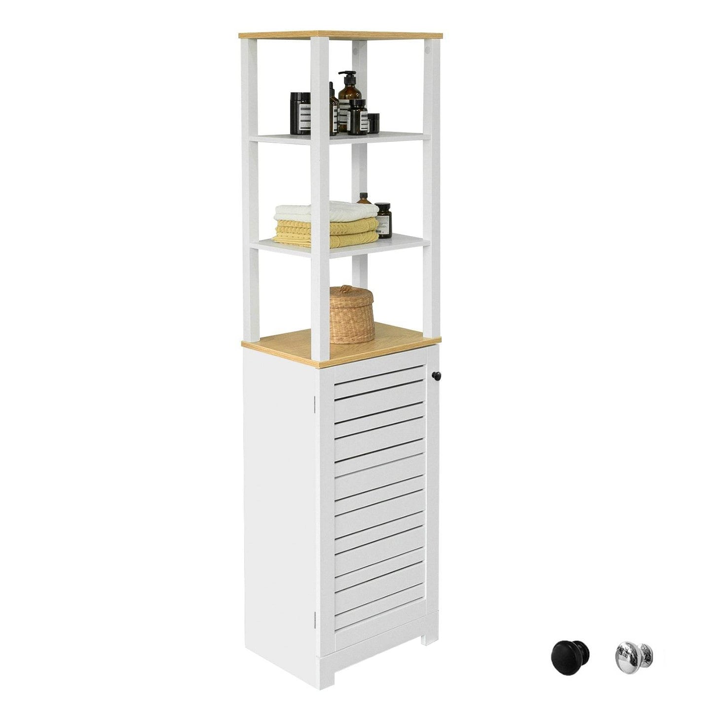 - Er besitzt drei offene Regalfächer und zusätzlich zwei Regalfächer mit Tür im unteren Bereich - bietet viel Platz für Badartikel; höhenverstellbarer Einlegeboden hinter der Tür.