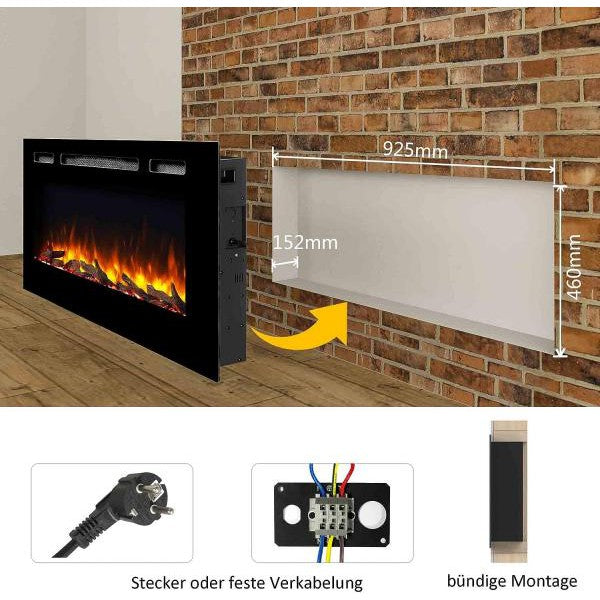 Lieferumfang: Elektro-Kamineinheit mit ca. 1,7 m langem Stromkabel (220V), Fernbedienung mit Batterien, Dekomaterial, Montagematerial, ausführliche Montage- und Bedienungsanleitung
