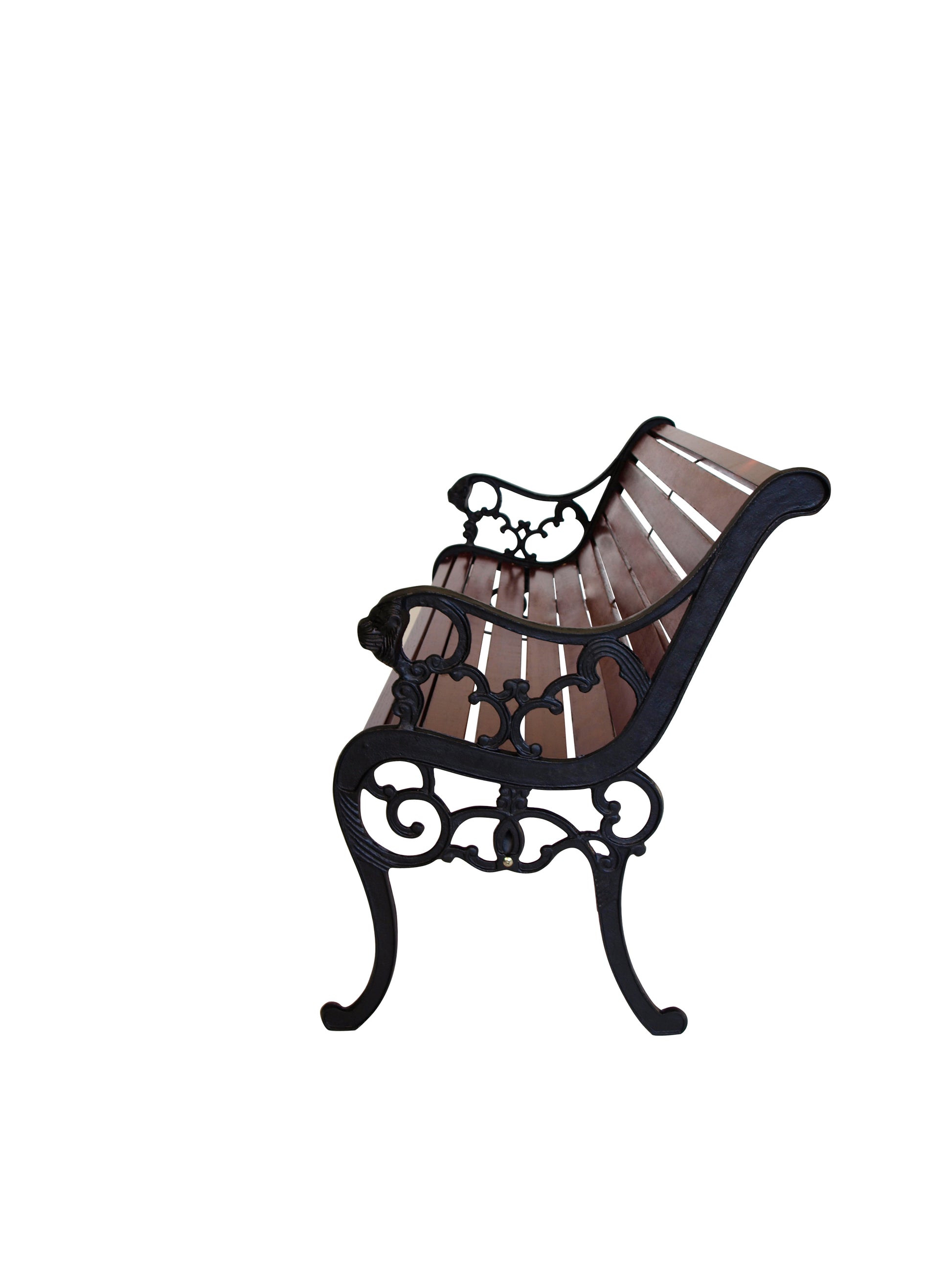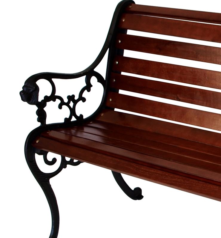 Die Seitenteile dieser klassischen Gartenbank im britischen Design werden aus massivem schwarz lackiertem Gusseisen hergestellt. Auf jeder Seite befindet sich zur Verzierung ein stilvoller Löwenkopf. Die Belattung besteht aus insgesamt 12 massiven, mahagonifarben beschichteten Hartholzlatten, Stärke 19mm.