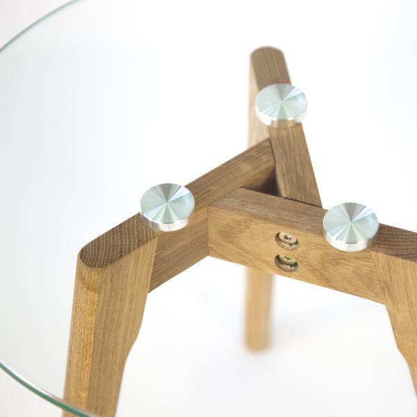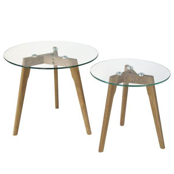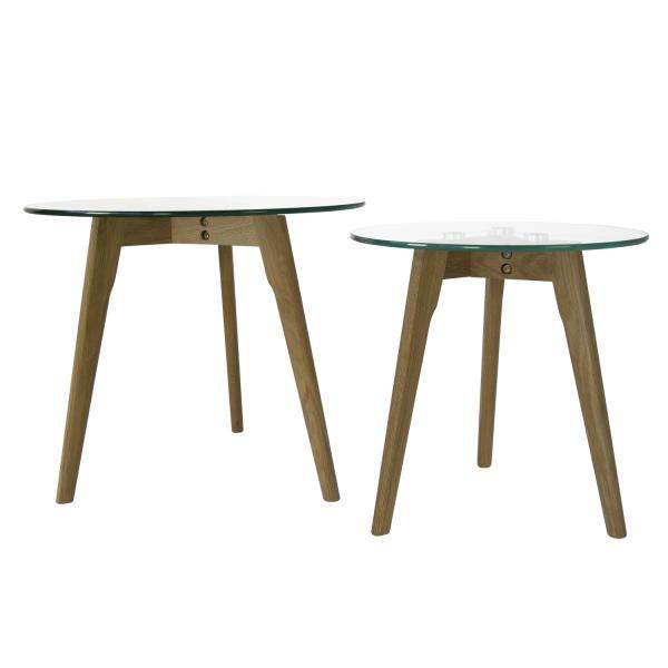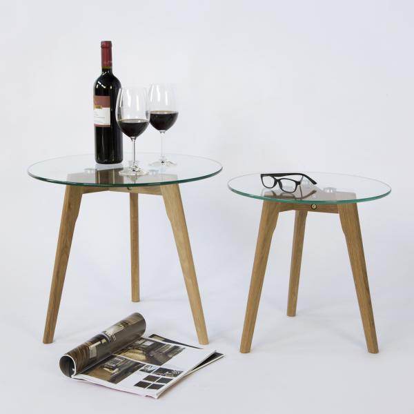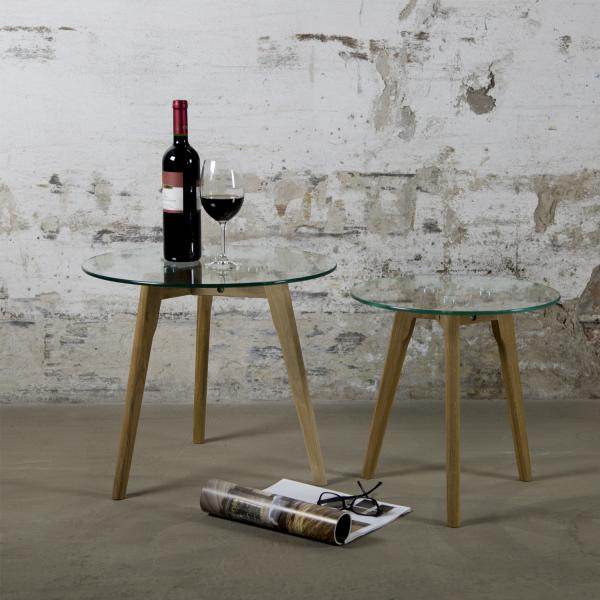 Unsere eleganten Beistelltische überzeugen mit ihrem Design im klassischen Retrostil. Die Materialkombination aus Glas und Holz verleiht einen zeitlosen Look. Die Tische in unterschiedlichen Größen lassen sich perfekt als kleine Couchtische oder auch Nachttische arrangieren. Beide Tische haben ein Gestell aus 3 seitlich abgespreizten Füssen aus massivem Eichenholz sowie einer edlen Glasplatte.