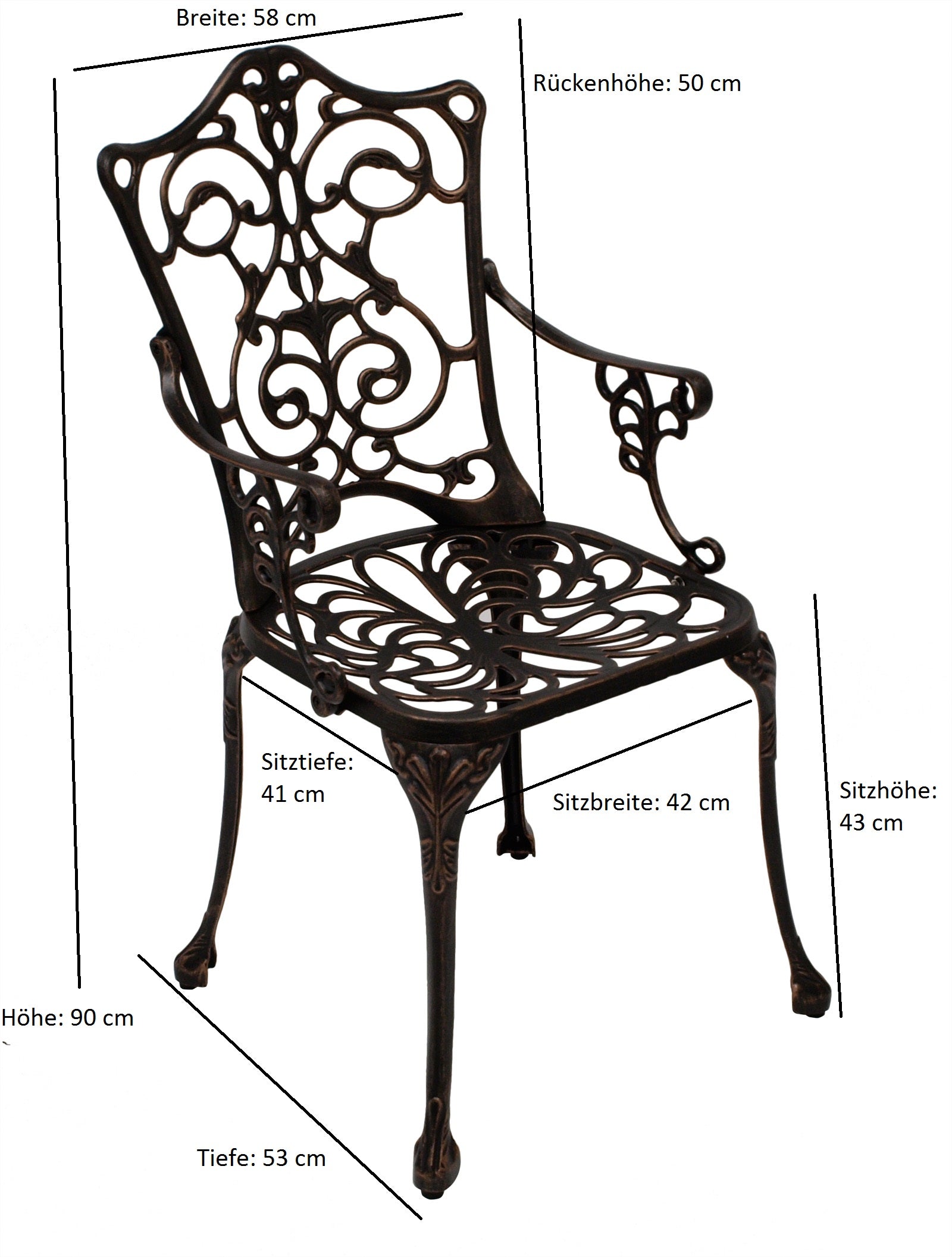 Alle Teile sind im Farbton bronze antik beschichtet. Das Set stellt mit seiner eleganten Erscheinung ein Schmuckstück für jeden Garten dar - sowohl als bequeme Sitzgelegenheit oder nur als attraktives Dekoelement.