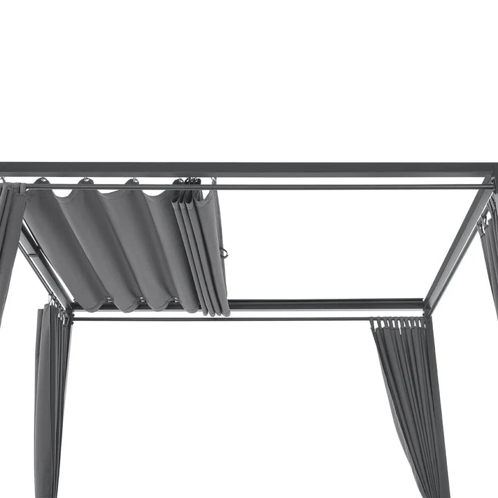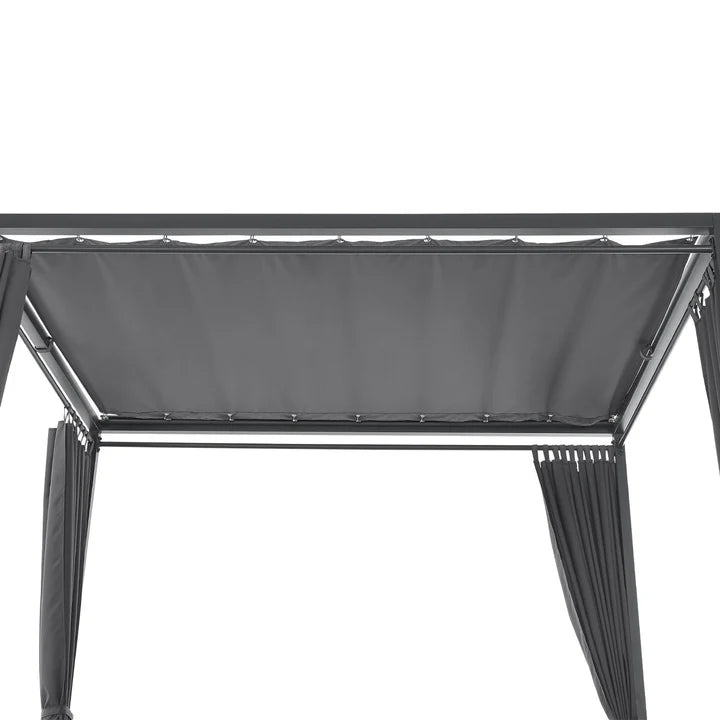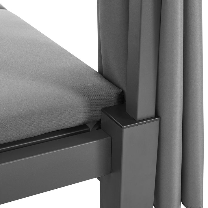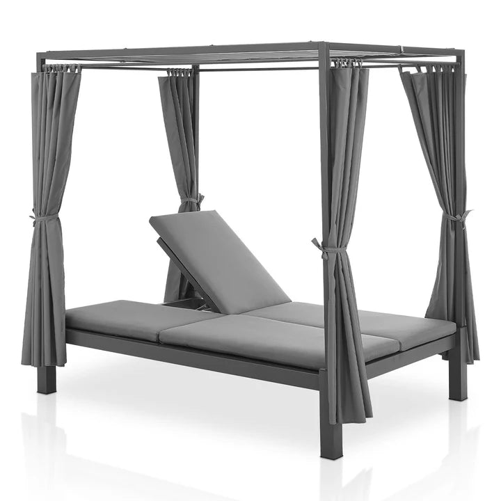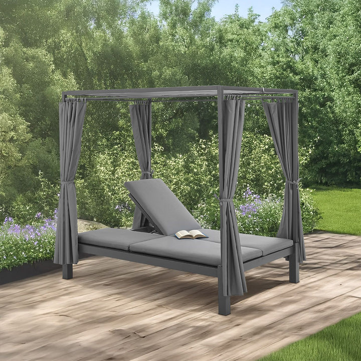 Mit dem edlen Doppel Loungebett Kreta mit Rückenlehne und Dach in Grau holst du dir pures Beach- und Urlaubsfeeling für den Garten, Balkon oder die Terrasse. Auf dem 140x200 cm großen Gartenmöbel mit pulverbeschichtetem Stahlgestell genießt du den Urlaub einfach zuhause. Entspanne zu zweit an einem romantischen Sommerabend oder mache es dir mit deiner Familie gemütlich. Die Vorhänge und das Dach aus Stoff dienen zugleich als Sicht- und Sonnenschutz. Passe diese flexibel an, für mehr Privatsphäre. Neben dem traumhaften Design sorgen dicke Kissen und eine verstellbare Lehne für hohen Komfort.