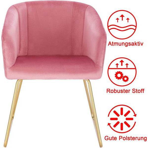 - ÄSTHETISCH & ERGONOMISCH: Die Kombination aus edlem glattem Samt und goldenen Metallbeinen macht den Esszimmerstuhl zu einem Blickfang und setzt exquisite Akzente in Ihrer Einrichtung. Mit seiner geschwungenen Rückenlehne und den abgeschrägten Armlehnen ist dieser Küchenstuhl ergonomisch und bietet Ihrem Rücken und Ihren Armen ausreichend Halt für ein äußerst bequemes Sitzen.