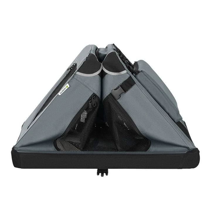 Die Hundetragetasche aus Oxford-Gewebe besitzt extra verstärkte Ecken für noch mehr Stabilität. Die großen Netztüren lassen sich mithilfe von Reißverschlüssen bequem öffnen und ermöglichen Ihrem geliebten Vierbeiner ein komfortables Ein- und Aussteigen.