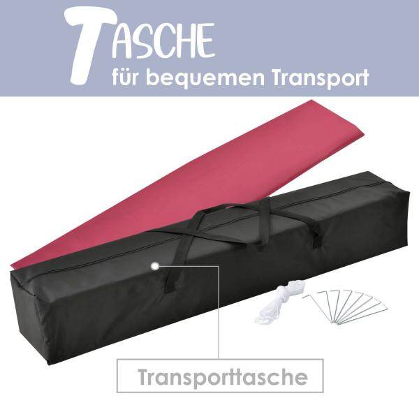 Durch die im Lieferumfang enthaltene Tasche lässt sich der Faltpavillon kinderleicht transportieren und platzsparend im Auto transportieren. Somit ist der Sonnenschutz auch ein exzellenter Begleiter beim Camping, Ihren nächsten Besuch am Strand oder fürs nächste Festival.