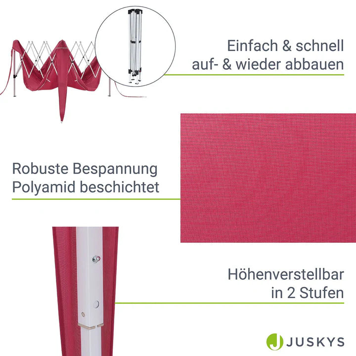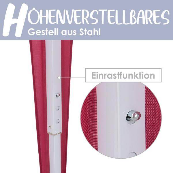 Das pulverbeschichtete Gestell aus Stahl ist in der Höhe 3-fach verstellbar und gewährleistet einen sicheren Stand. Die Pulverbeschichtung erhöht die Widerstandsfähigkeit des Gestells vor äußeren Einflüssen. Die Einrastfunktion verhindert ein ungewolltes Zusammenklappen des Pavillons.