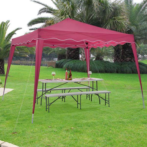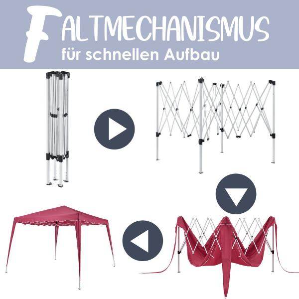Das praktische Faltsystem ermöglicht einen schnellen Auf- und Abbau innerhalb weniger Minuten – ganz ohne Werkzeug. Das Gestell lässt sich einfach aufklappen. Sie sparen sich das lästige Zusammenstecken der Stangen. Zugleich ist der Pop-up Pavillon schnell und flexibel einsetzbar.