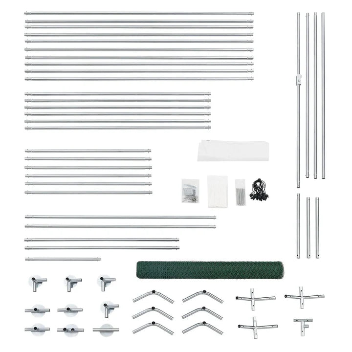 Die Stangen und Steck-Klick-Verbindungen sind aus verzinktem Metall. Die Verzinkung schützt vor Rost, Witterung und hält das Freilaufgehege für Hühner stabil. Für den sicheren Stand sorgen Füße mit Bodennägeln (in der Erde befestigt). Reinigen lässt sich das Kleintiergehege mit einem feuchten Tuch.