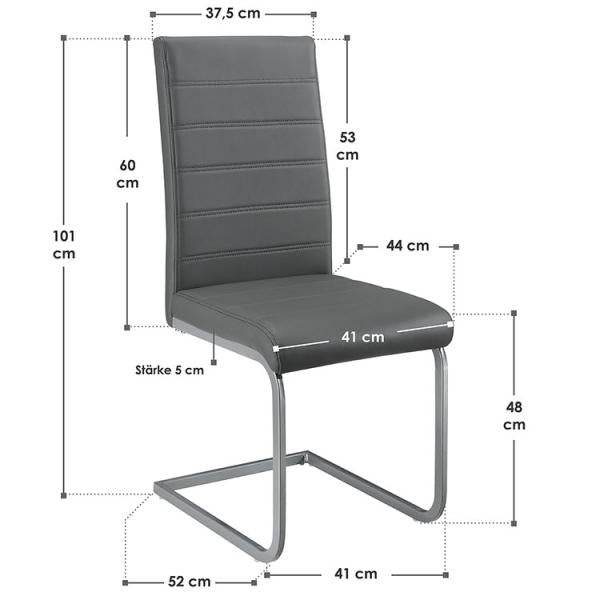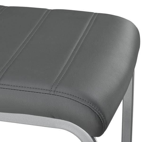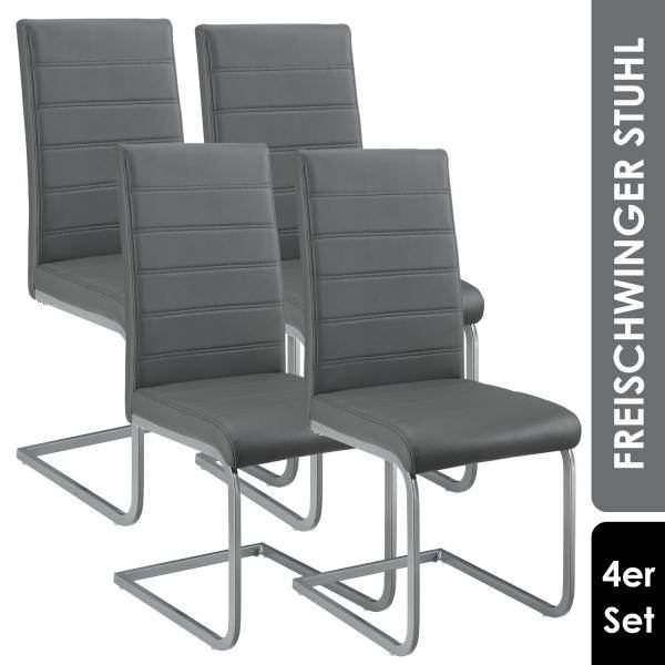 Sie möchten beim Sitzen leicht schwingen? Mit Körperdruck bringen Sie das 4er-Set Freischwinger Stuhl Vegas (Grau) in kleine Schwingungen und beugen so einer steifen Sitzhaltung vor. Verbringen Sie hier gemütliche Stunden mit Ihrer Familie oder Freunden! Gefertigt ist der stabile Esszimmerstuhl aus Metall und weichen Polstern mit Kunstleder-Bezug. Optisch überzeugt der elegante Schwingstuhl in Esszimmer, Küche, Wohnzimmer oder Arbeitszimmer. Mit der schlichten Lederoptik verleihen die modern gestalteten Esstisch Stühle einen stilvollen Charme und zeigen sich überaus pflegeleicht.