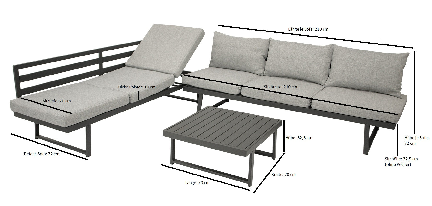 Die Sofas verfügen jeweils über ein 4-fach verstellbares Sitzteil, so dass die Sofas auch als bequeme Liege genutzt werden können. Die Rückenteile sind aufsteckbar und können auf jeder Seite befestigt werden. Man kann diese auch komplett weglassen und hat so beispielsweise eine Doppelliege oder zwei Einzelliegen.
