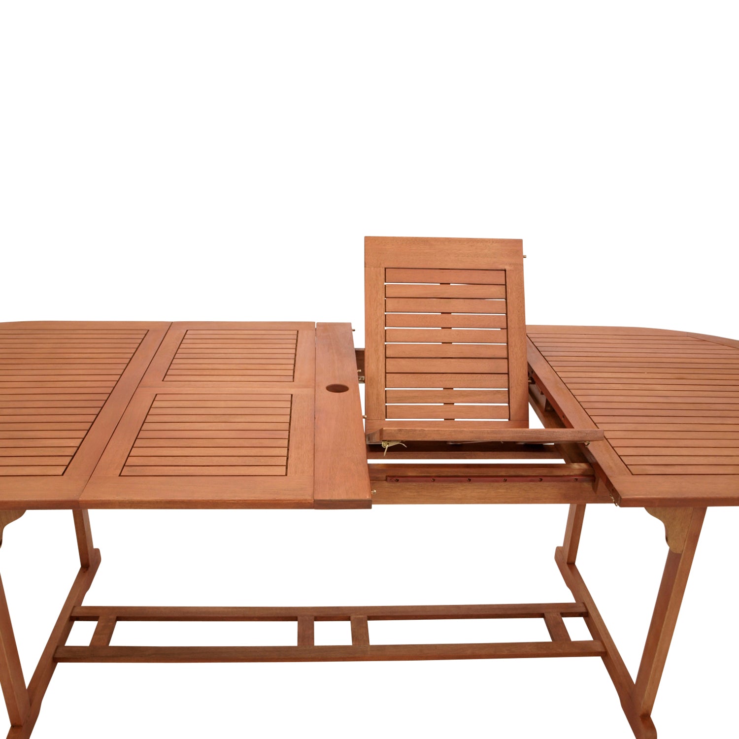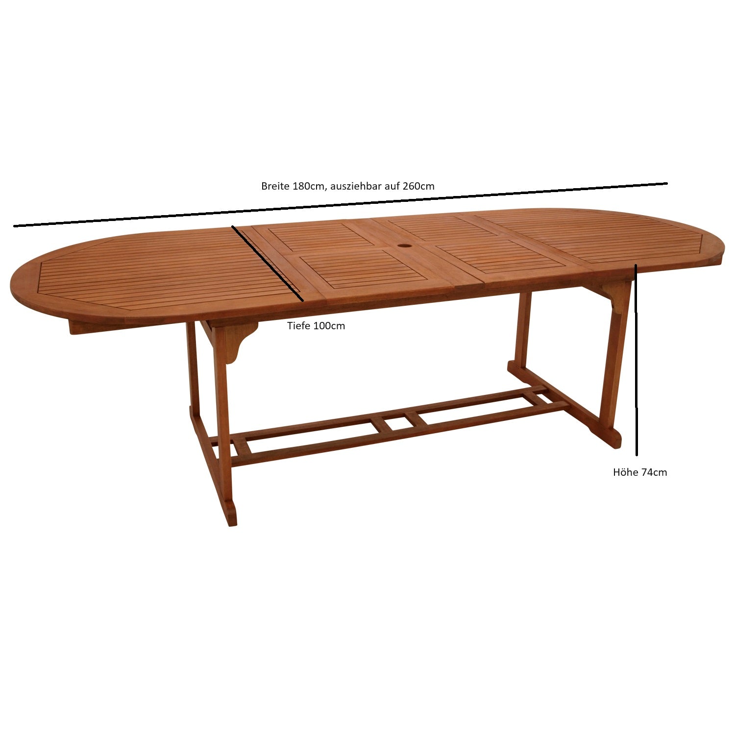 Der extra lange Tisch in ovaler Form kann mitteils Ausziehmechanismus von 180cm auf 260cm verlängert werden und bietet so mühelos Platz für mindestens 8 Personen. In der Mitte befindet sich ein Schirmloch.