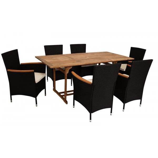 Garnitur Sitzgruppe MONTREUX 7-teilig, Geflecht schwarz + Akazien Holz, Tisch 90x180cm